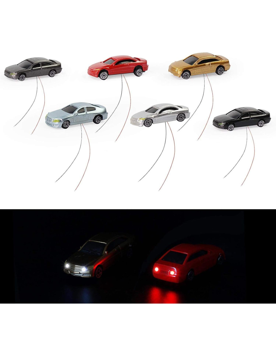 Características: Nuevo y de alta calidad. ¡Perfecto para Diseño de Ferrocarriles y Edificios! Luz dentro del coche, completo con cables y LEDs. Este coche iluminado es un accesorio muy útil para el diseño de trenes en miniatura y edificios, diseño de estaciones de tren, modelo de proyecto escolar y casa de muñecas en miniatura. Especificaciones: Marca: evemodel. Tamaño: Como se muestra en la imagen. Escala: 1:150~1:160, adecuado para Escala N. Voltaje: 12v~16v. Color: Color variado. Material: Plástico. Paquete incluido: 12 coches de modelo.