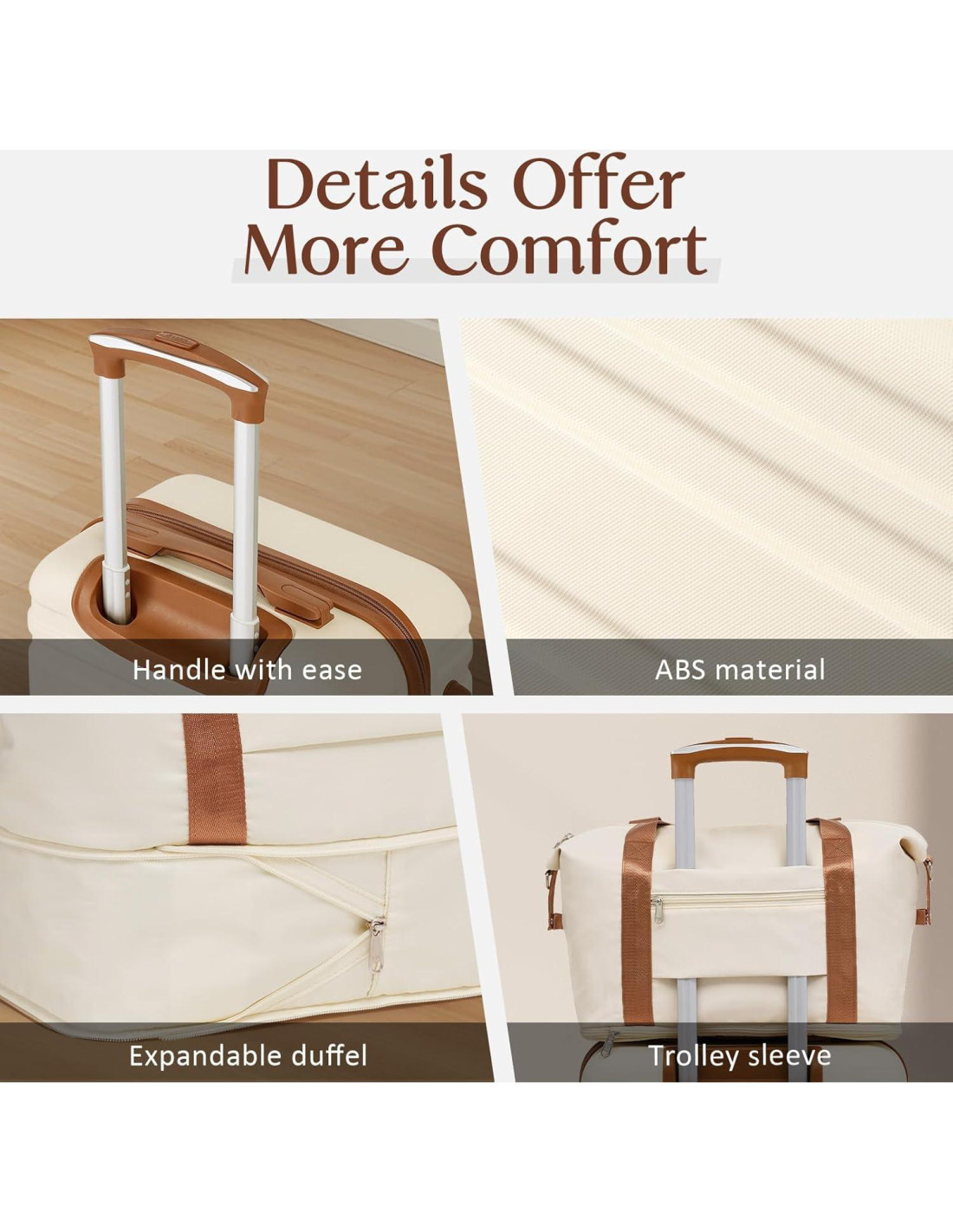 - La bolsa tipo duffel, la mochila y la bolsa de aseo están hechas de tela de poliéster que es ligeramente resistente al agua. La bolsa tipo duffel y la mochila están diseñadas con una manga trasera, para que puedas adjuntarlas convenientemente al mango retráctil de la maleta. Hay múltiples bolsillos funcionales en la mochila, lo que la hace versátil para diferentes necesidades de viaje.