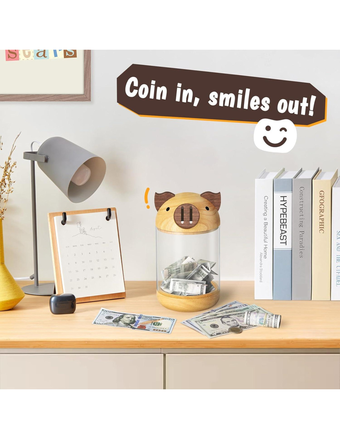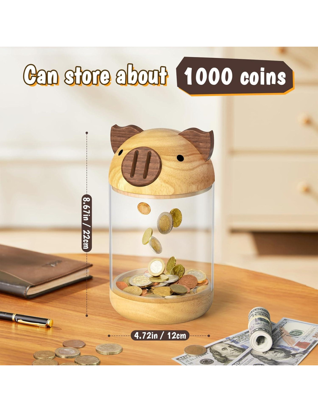 - Materiales Premium: Fabricada con madera maciza en la parte superior e inferior, con un cilindro de acrílico duradero en el centro, este banco de dinero es resistente y duradero. La madera está sellada con aceite de cera natural para protección y todos los bordes son redondeados para seguridad