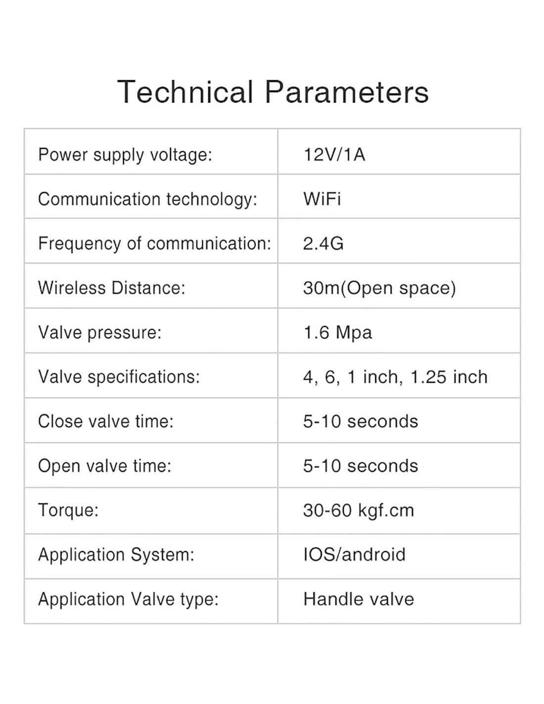 -Cuando sales, ¿te preocupa olvidar apagar el equipo y causar una fuga de gas/agua? ¿Te preocupa que nadie riegue las flores por ti cuando tienes vacaciones? Ahora puedes programar el temporizador para cerrar o abrir la válvula automáticamente con tu teléfono inteligente, lo que te permite tener unas vacaciones sin preocupaciones. -La válvula inteligente WIFI es un producto de diseño novedoso con corta distancia, bajo costo, bajo consumo de energía y alta fiabilidad. Este modelo utiliza tecnología WiFi internacional y es totalmente compatible con redes WiFi. Puede usarse como un punto de relé de señal y algunos dispositivos. -Cuando sales, ¿te preocupa olvidar apagar el equipo y causar una fuga de gas/agua? ¿Te preocupa que nadie riegue las flores por ti cuando tienes vacaciones? Ahora puedes programar el temporizador para cerrar o abrir la válvula automáticamente con tu teléfono inteligente, lo que te permite tener unas vacaciones sin preocupaciones. -La válvula inteligente WIFI es un producto de diseño novedoso con corta distancia, bajo costo, bajo consumo de energía y alta fiabilidad. Este modelo utiliza tecnología WiFi internacional y es totalmente compatible con redes WiFi. - Puede usarse con el sensor de inmersión de agua, agregar un modo de escena a la aplicación móvil, y combinar la válvula de agua y el sensor de inmersión de agua en un grupo para verificar fugas de agua. La válvula de agua se cierra automáticamente cuando se detecta una fuga. Especificaciones: Voltaje de potencia: DC12V 1A Protocolo de radio: WiFi 2.4GHz Distancia inalámbrica: 30 metros Presión de la válvula: 1.6MPA Especificaciones de la válvula: 4, 6, 1 pulgada, 1.25 pulgadas Tiempo de apagado automático de la válvula: 5-10 segundos Tiempo de apagado eléctrico de la válvula: 5-10 segundos Par: 30-60 kgf.CM Tipo de válvula de aplicación: Válvula de mango Sistema de aplicación: IOS/Android Compatible & Características: Control por voz (Alexa / Asistente de Google) Control remoto de APP (Tuya Smart / Smart Life) Control de temporización (Preestablecer el dispositivo encendido o apagado)