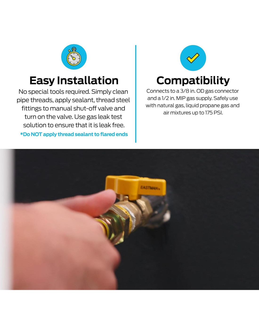 - VÁLVULA DE BOLA DE GAS EASTMAN: Ideal para conexiones de parrillas, calentadores de agua, chimeneas y hornos, esta válvula de gas proporciona flexibilidad para tus proyectos de mejora del hogar, convirtiéndola en una opción confiable para cualquier configuración de línea de gas
