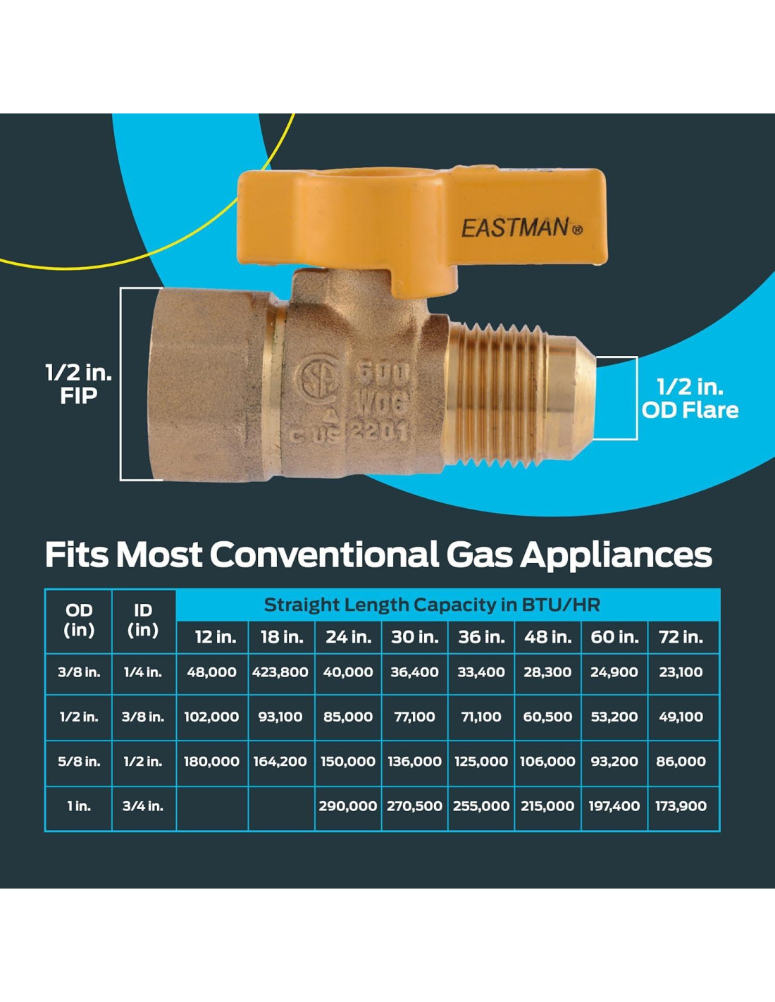 - ESPECIFICACIONES: Esta válvula de bola de latón se conecta a un conector de gas de 1/2 pulgada OD y un suministro de gas de 1/2 pulgada FIP. Uso seguro con gas natural, gas propano líquido y mezclas de aire hasta 175 PSI