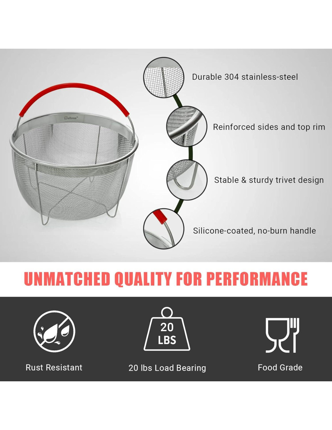 - CONSTRUCCIÓN DE ACERO INOXIDABLE Y REFUERZO SÓLIDO EN CUATRO LADOS Y BORDE SUPERIOR - material de acero inoxidable 304 de larga duración es apto para lavavajillas, la construcción sólida añade fuerza y estabilidad a la cesta coladora y el mango ha sido probado para levantar hasta 20 libras (9,07 kg), mucho más de lo necesario.