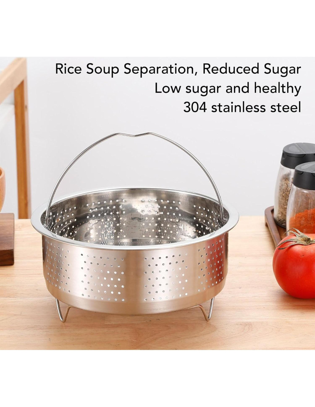 - Eliminación Efectiva de Azúcar: A través de ebulliciones y filtraciones repetidas, esta cesta de vapor elimina efectivamente una cantidad significativa de amilopectina del arroz, resultando en un contenido de azúcar reducido. Cesta de vapor de acero inoxidable con mango, inserto para cocedor de arroz, rejilla de vapor para alimentos, huevos, verduras, frutas.