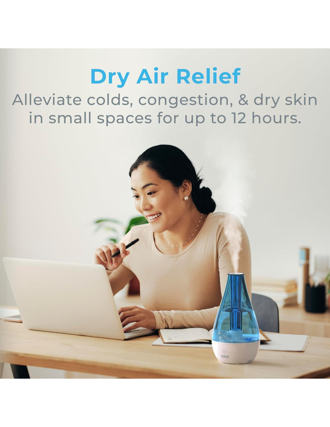 - Alivio de Resfriados y Congestión: La humedad equilibrada y los espacios humedecidos en tu hogar durante los meses secos pueden ayudar a brindarte a ti y a tu familia el alivio tan necesario. Ayuda a mejorar resfriados, tos, congestión, dolor de garganta, alergias, problemas sinusales y piel seca con este mini humidificador.