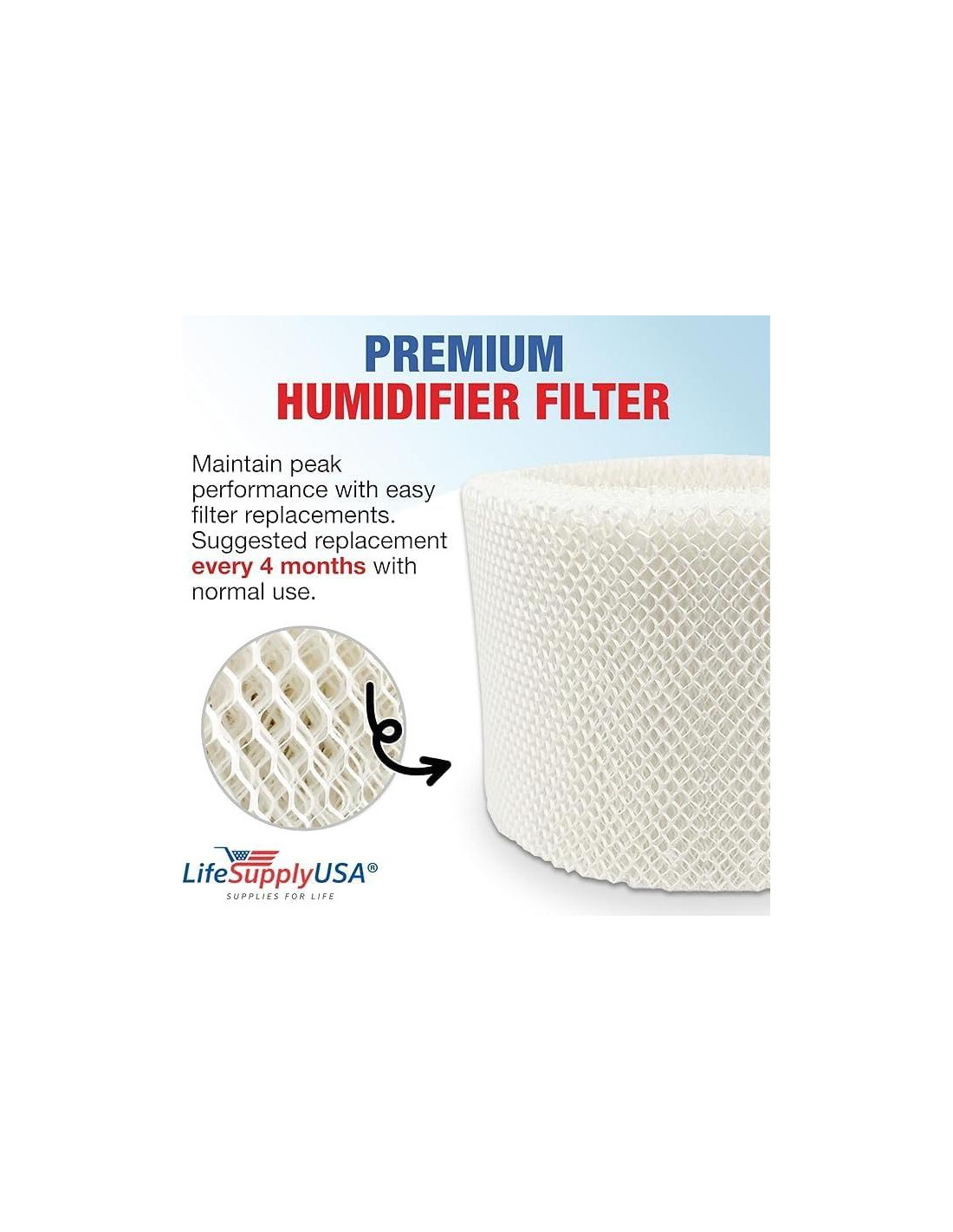 Optimiza la absorción y evaporación de agua para mantener niveles de humedad ideales y mejorar la calidad del aire interior. Instala fácilmente nuestro filtro de humidificador en solo unos pocos pasos. Diseñado para la conveniencia, disfruta de aire fresco y limpio en minutos. Los filtros de humidificador LifeSupplyUSA están diseñados para durar, proporcionando protección y humedad. ¡Extiende la vida de tu purificador de aire con nuestros filtros! Para el mejor rendimiento, recomendamos reemplazar tu filtro de humidificador cada 6 a 12 meses, dependiendo del uso y la calidad del aire.