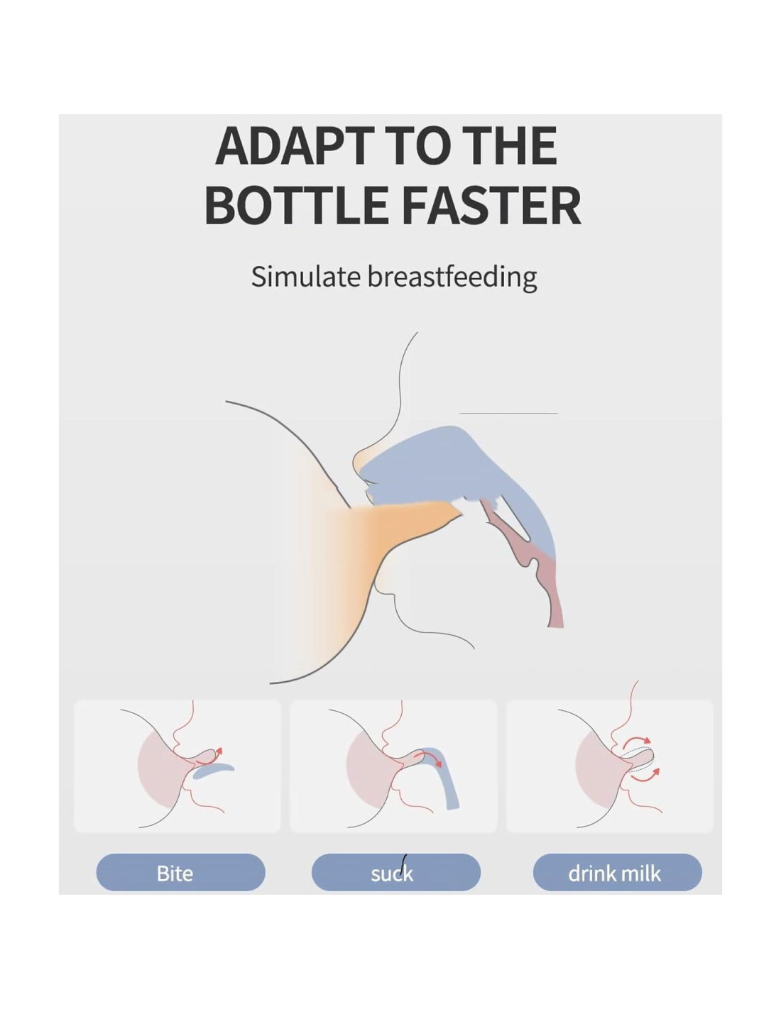- Transición de la Lactancia con tetina en forma de pecho: Con una forma de pecho amplia, las tetinas imitan la forma y sensación de un pecho para que los bebés tengan una sensación de satisfacción y seguridad que facilita la transición de pecho a botella; Hechas de silicona de grado alimenticio, las tetinas han pasado decenas de miles de experimentos de tracción y pueden proteger bien las encías del bebé;
