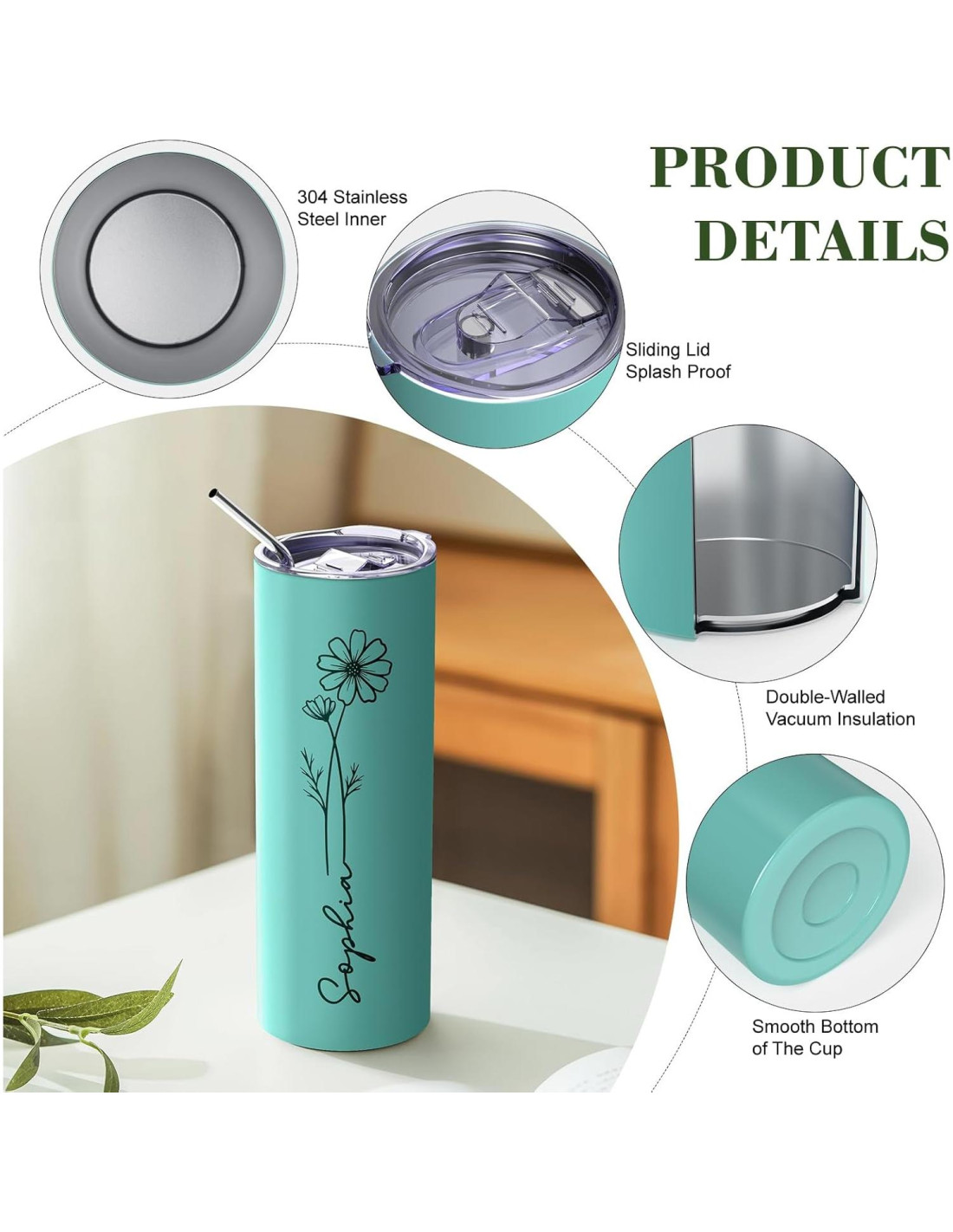 Vaso Personalizado con Flor de Nacimiento y Nombre, Vaso Delgado Personalizado con Tapa y Pajilla 20oz Vaso Aislado Acero Inoxidable Vaso de Café Personalizado Regalos de Cumpleaños y Regalos del Día de la Madre para Mujeres