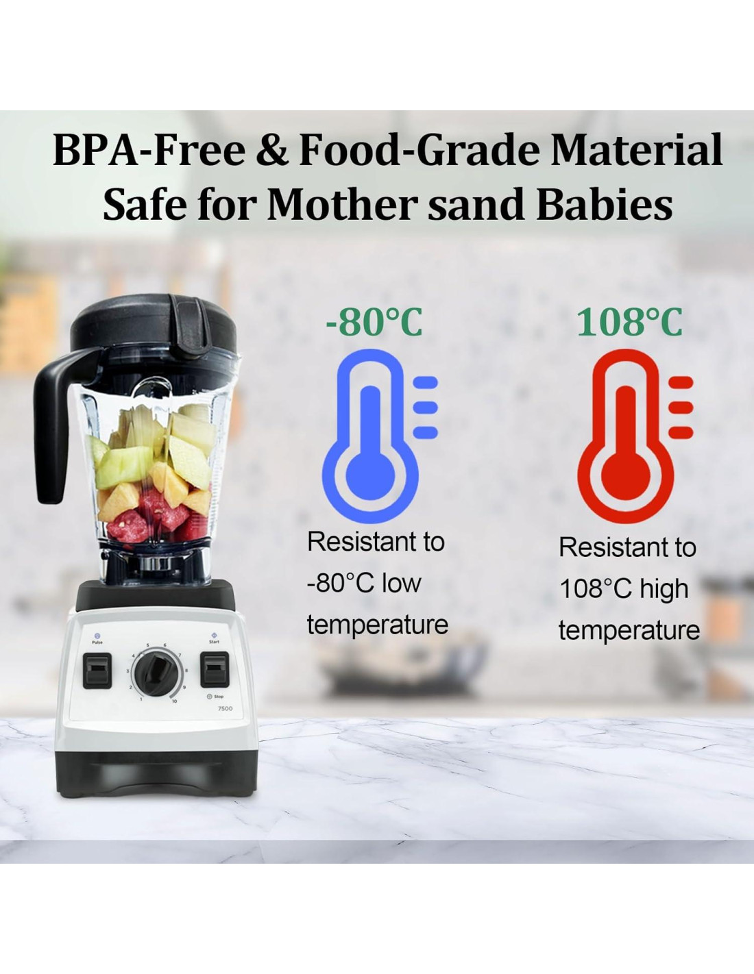 - Material Duradero Esta jarra de reemplazo para vitamix está hecha de los materiales más seguros libres de BPA, con un diseño reforzado, es altamente resistente a roturas. Puede soportar temperaturas que van desde -50C hasta un máximo de 150C sin liberar sustancias nocivas, manteniendo la salud de tu familia. La base ha sido mejorada para mejorar el sellado y reducir fugas, asegurando un funcionamiento silencioso incluso a altas velocidades.