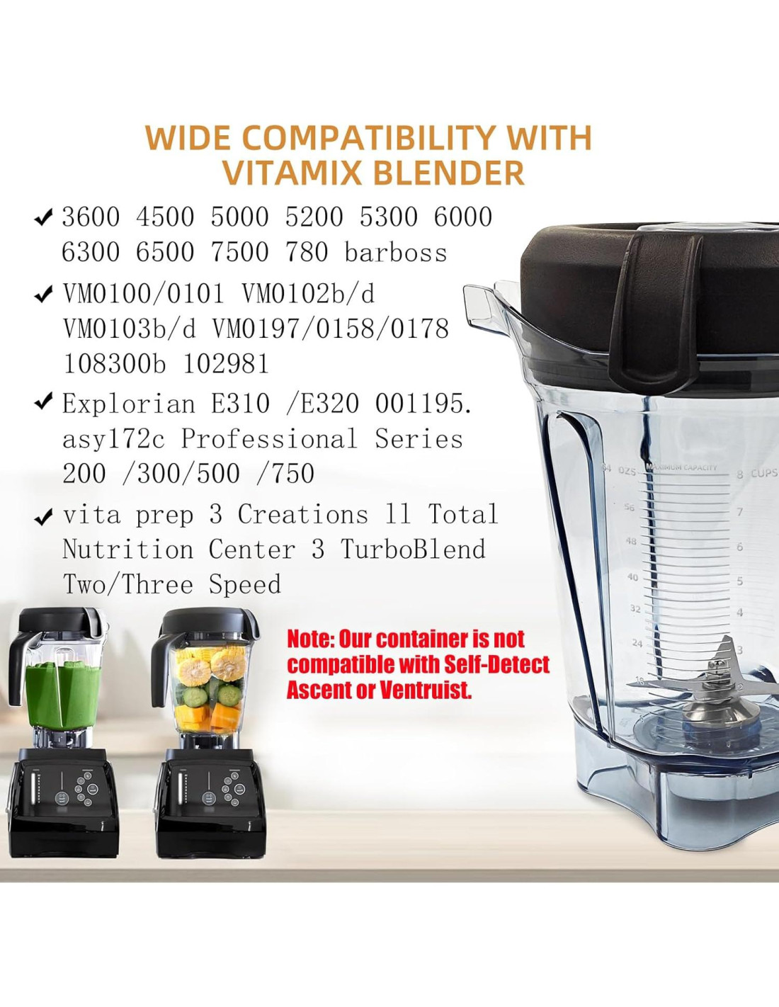 - Compatibilidad Universal - Esta jarra de reemplazo de 64 oz de perfil bajo está diseñada para ser compatible con la licuadora Vitamix 5200, compatible con Vitamix 750, 5000, 6300, 7500, vm0102, vm0103, vm0197, E310, y la taza de licuadora de la serie Clásica Explorian Comercial.