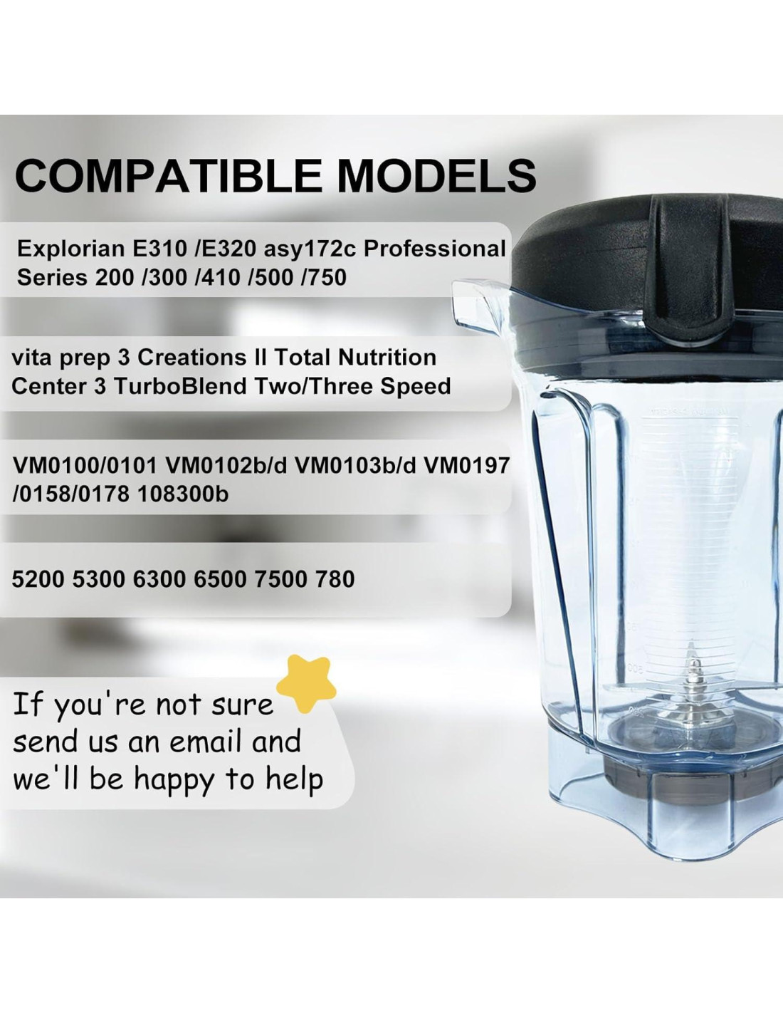 - COMPATIBLE CON VIRTUALMENTE CUALQUIER LICUADORA: Jarra/Contenedores/Tazas de 64OZ de Bajo Perfil para vitamix compatible con licuadoras vitamix clásicas G/C/comerciales/explorian series: 4500, 5000, 5200, 5300, 6000, 6300, 6500, 7500, Explorian E310, Professional Series 200/300/500/750, A 2300/2500, Creations II, VM0102, VM0103, VM0197. Nota: Nuestro contenedor no es compatible con Self-Detect Ascent o Ventruist. Si no puede confirmar, envíenos un correo electrónico y estaremos encantados de ayudarle a confirmar