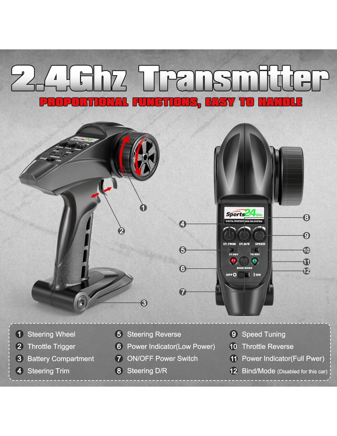- Sistema de control remoto de 2.4 GHz. Este camión controlado por radio tiene un transmisor de 2.4GHz que le da un rango de control de más de 330 pies (100,58 m), permitiéndole competir con muchos coches de carreras sin interferencia de señal. El control electrónico de velocidad sin escobillas de 35A a prueba de salpicaduras tiene una función de protección contra sobrecalentamiento y sobrecorriente, así como un corte automático por bajo voltaje de batería. El ágil servo de 3 hilos de 25g se introduce con este camión monstruo controlado a distancia.