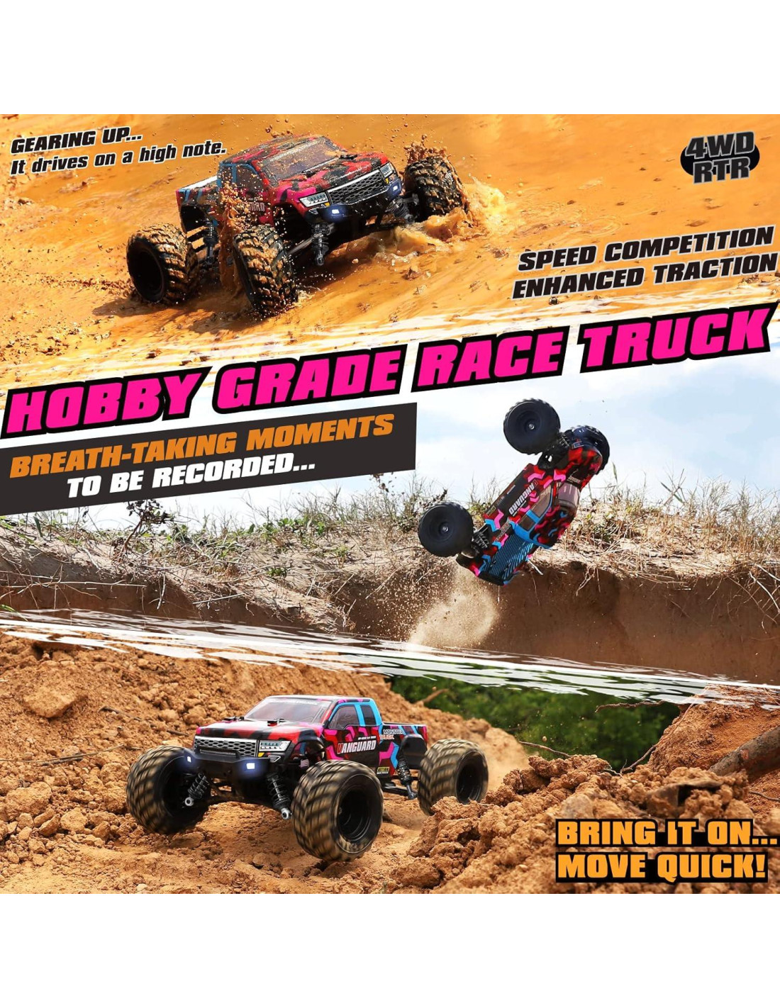 - El sistema de radio 2.4Ghz proporciona una distancia de control de 280 pies sin interferencia de señal, lo que permite a múltiples jugadores competir juntos. El control del gatillo es ajustable del 40% al 100% de control de aceleración, lo que es único para este camión monstruo de control remoto para adultos y niños. El nivel de impermeabilidad IPX4 hace que sea un poco difícil para este camión de control remoto encharcarse en charcos o lugares fangosos. La invasión de agua salada está prohibida. El servo de dirección independiente de 3 hilos introducido con este vehículo 4WD hace que el control de dirección sea más receptivo y estable.