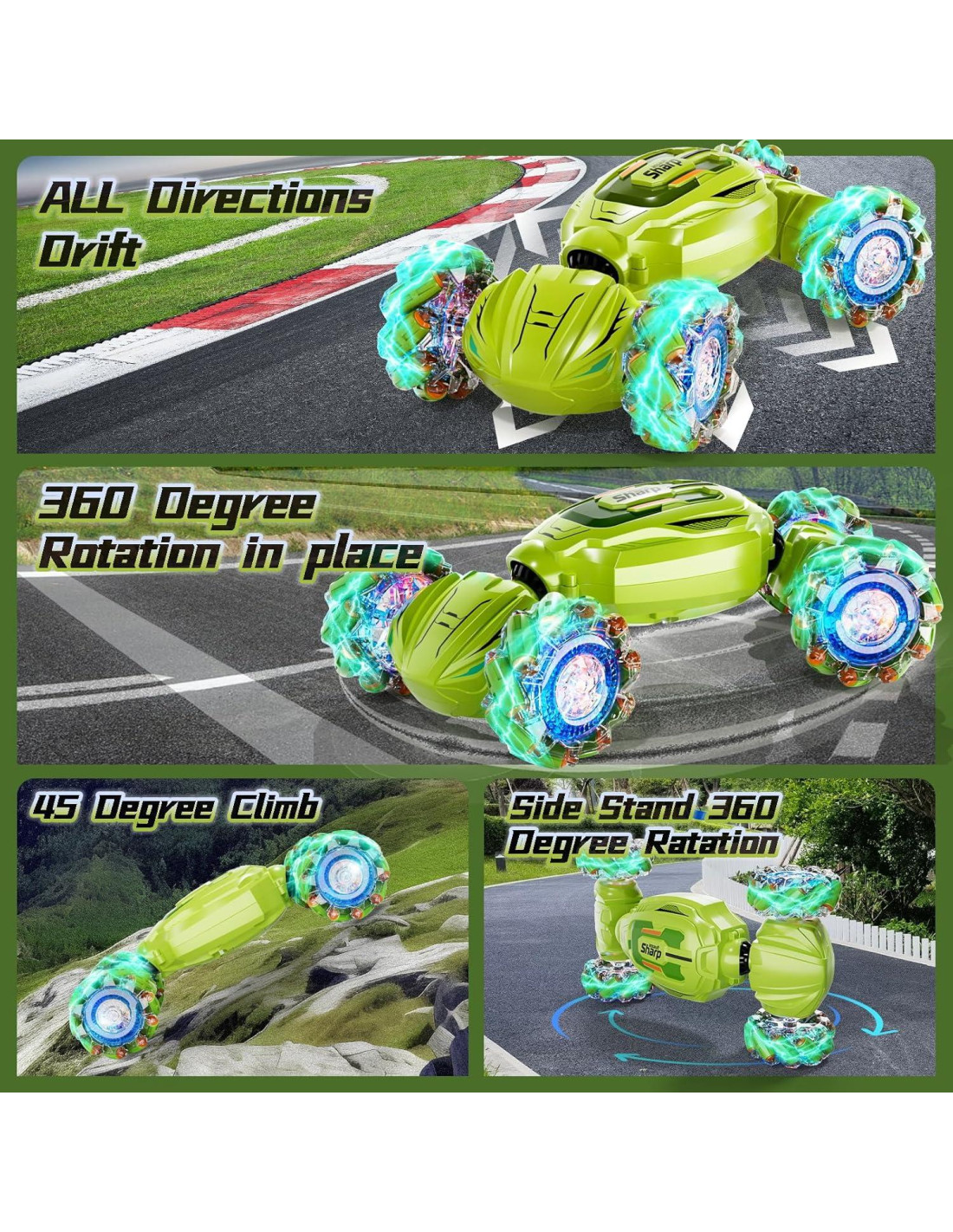- Acrobacias emocionantes de 360: ¡Mejora tu tiempo de juego con la versión 2024 de nuestro coche RC de gestos 4WD! Capaz de derrapar en todas las direcciones, realizar volteretas de doble cara y ejecutar rotaciones de 360 grados, este coche ofrece experiencias de carrera dinámicas. Cambia sin esfuerzo entre modos en carretera y fuera de carretera mientras disfrutas de luces vibrantes y música genial que aumentan la emoción.