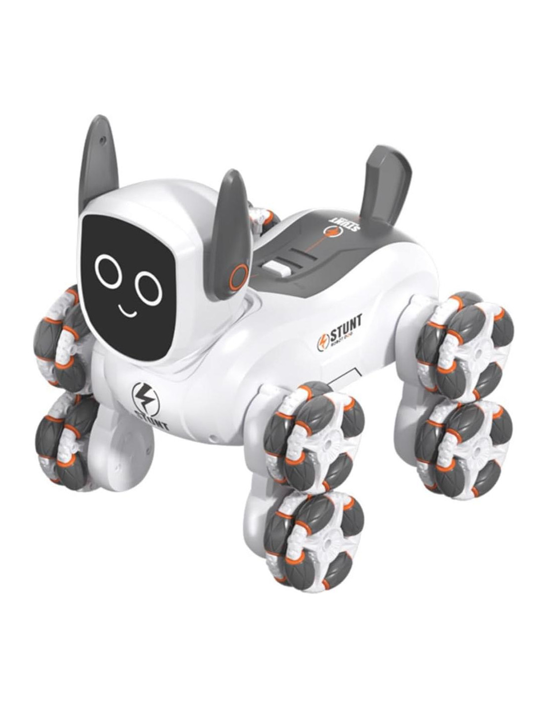 - [Robot Perro RC Stunt 4WD] Este genial coche de control remoto tiene ocho ruedas y está equipado con un control remoto inalámbrico. Simula varios movimientos de un perro real según tus instrucciones. Además de las funciones básicas de movimiento hacia adelante y hacia atrás; También hay acrobacias como giro a la izquierda/derecha, rotación de 360, escalada de obstáculos, etc; Deriva; Demostración automática con un clic.