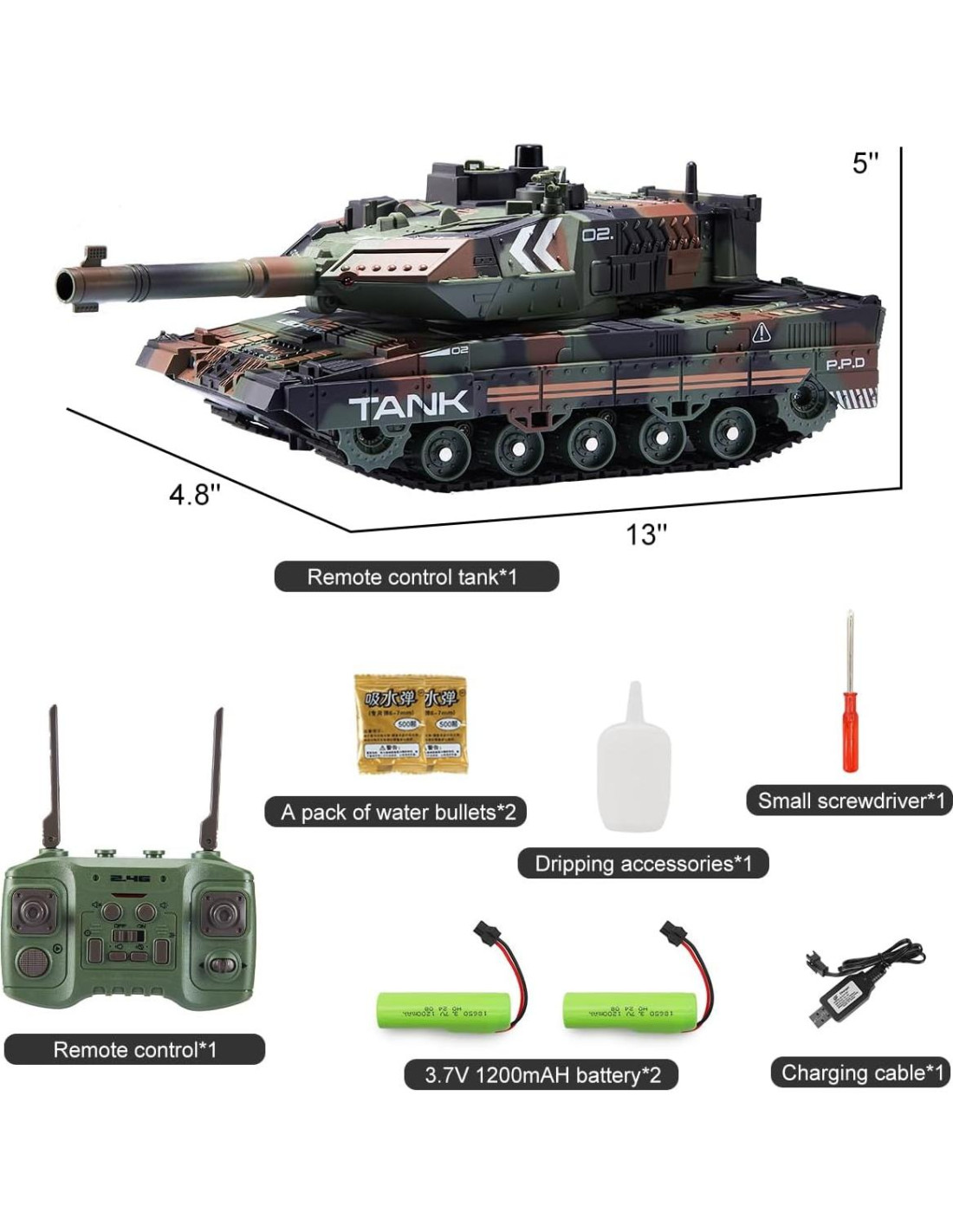 - Tanque de Control Remoto de 13 Canales: El tanque RC puede moverse hacia adelante/atrás, girar a la izquierda/derecha, rotar 270, disparar balas de agua, reproducir música simulada y simular la pulverización de humo, proporcionando simulaciones y aventuras militares multifuncionales para sus niños.