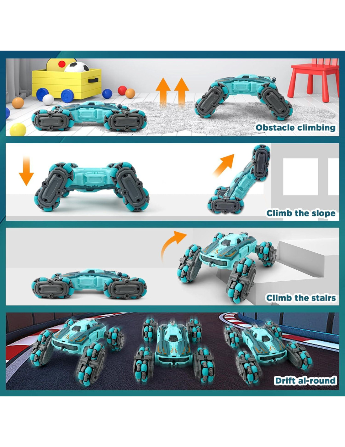 - Tracción de 8 Ruedas con Pistas de Escalada Desmontables: ¡Enfrenta cualquier terreno con facilidad! El diseño potente asegura estabilidad y control, mientras que las pistas desmontables incluidas proporcionan tracción adicional para escalar pendientes pronunciadas sin esfuerzo.