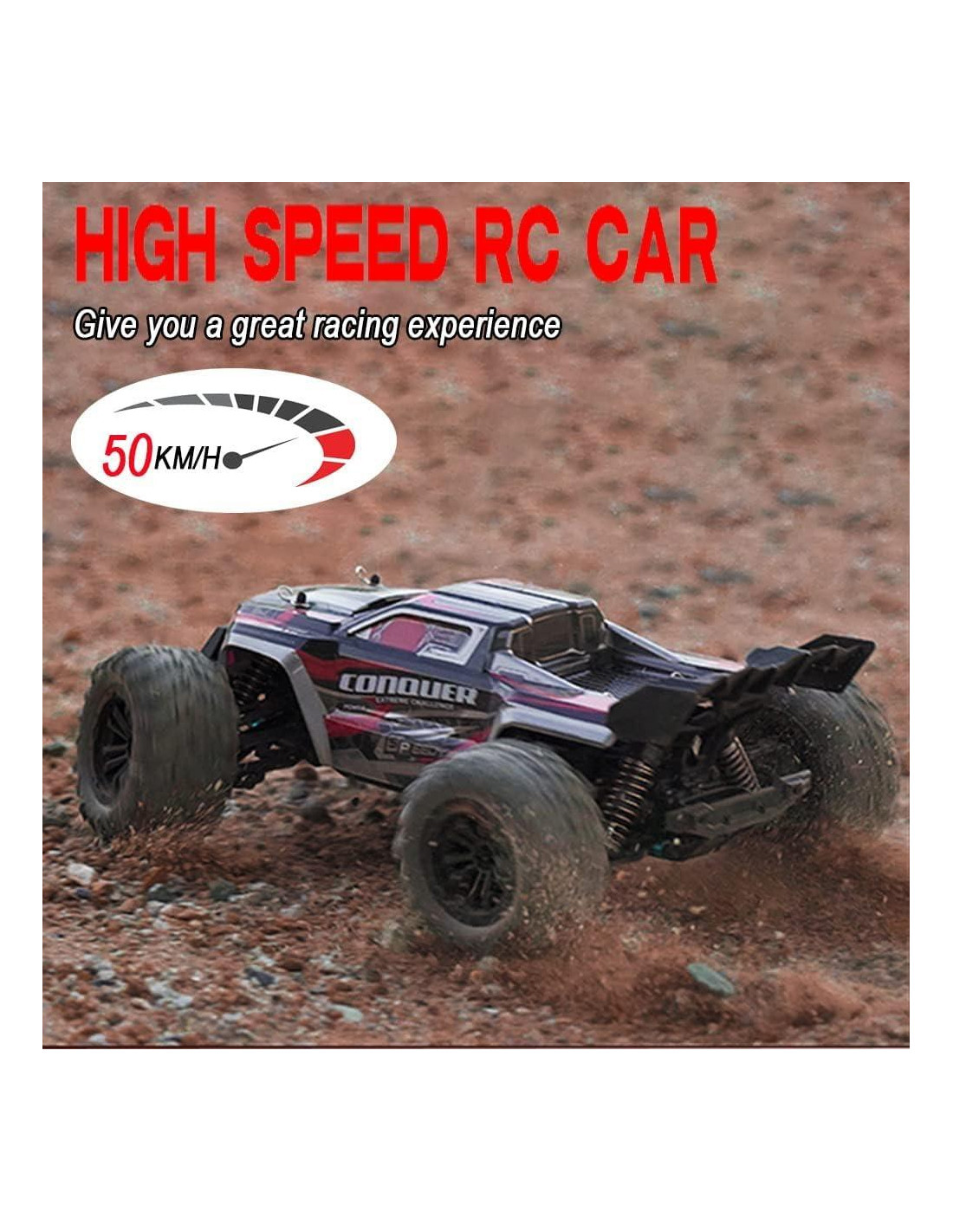 - Coche RC Grande para Todos los Terrenos: Equipado con neumáticos de goma, rueda elevada, amortiguadores metálicos de suspensión y una estructura de chasis robusta, este buggy RC puede correr y saltar sobre barro, playa, hierba, nieve, caminos de roca, dunas de arena