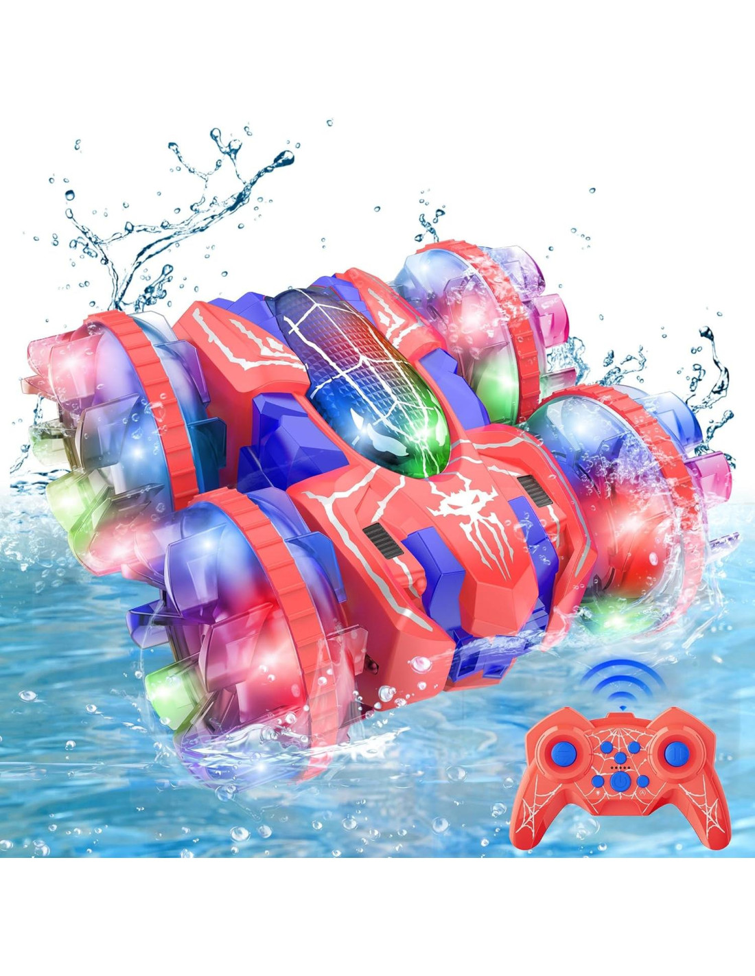 - Coche RC Anfibio Impermeable Mejorado: Nuestro coche de control remoto anfibio tiene un cuerpo y control remoto impermeables, y el diseño de sellado preciso asegura que esté protegido contra daños por agua, puede girar 360 grados, volteretas hacia adelante y hacia atrás. Ya sea en tierra o en el agua, puedes disfrutar de diversión interminable con este juguete. Un regalo sorpresa para tus hijos