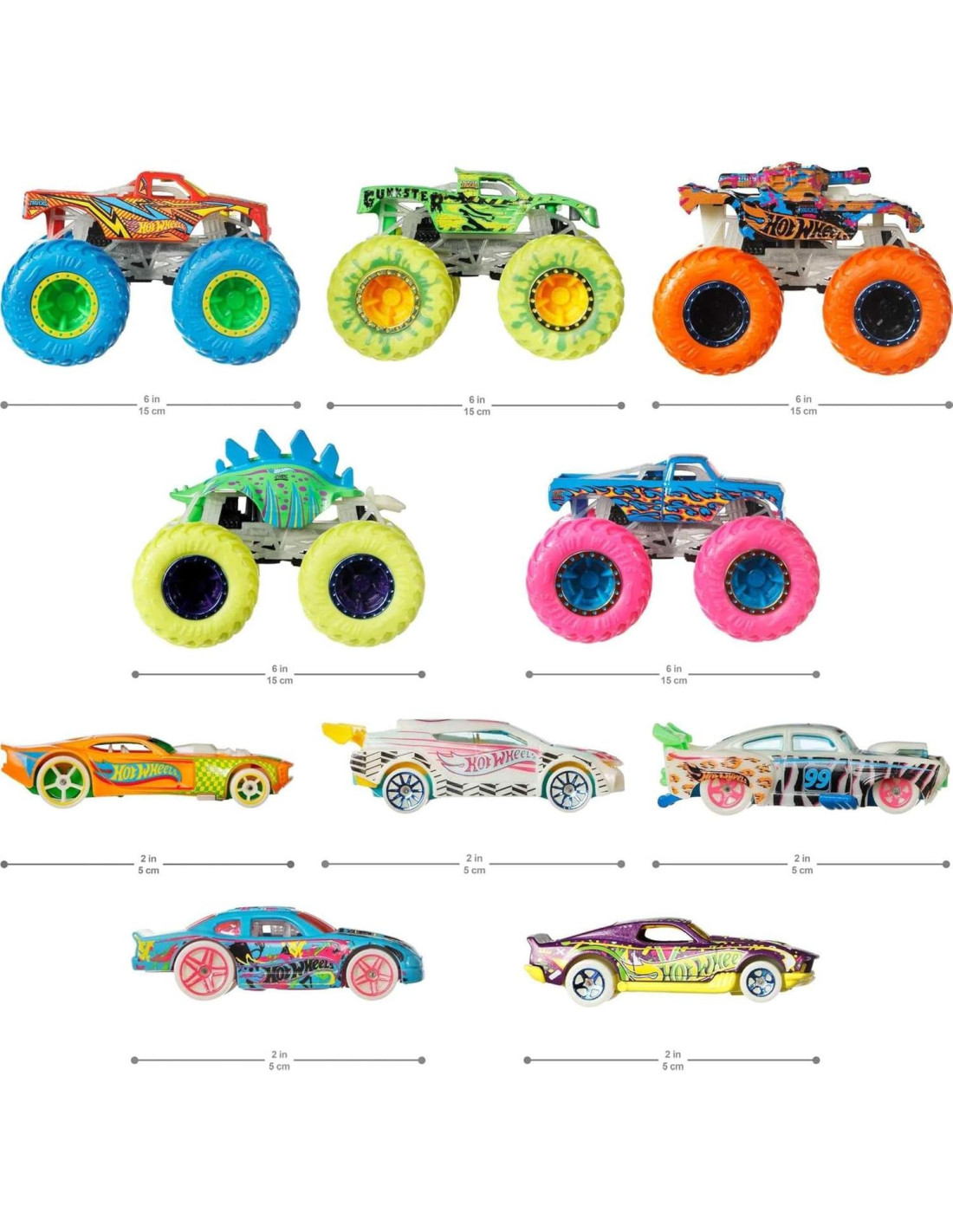 - El conjunto incluye 5 Camiones Monstruo Hot Wheels y 5 autos Hot Wheels.