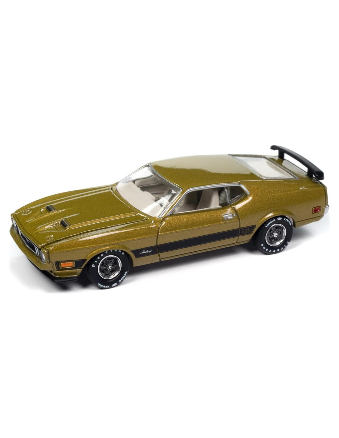 Modelo de coche de colección a escala 1/64 completamente nuevo del 1973 Mach 1 Verde Brillante Dorado Metálico con Rayas Negras "Vintage Muscle" de Auto World 64482-AWSP173A