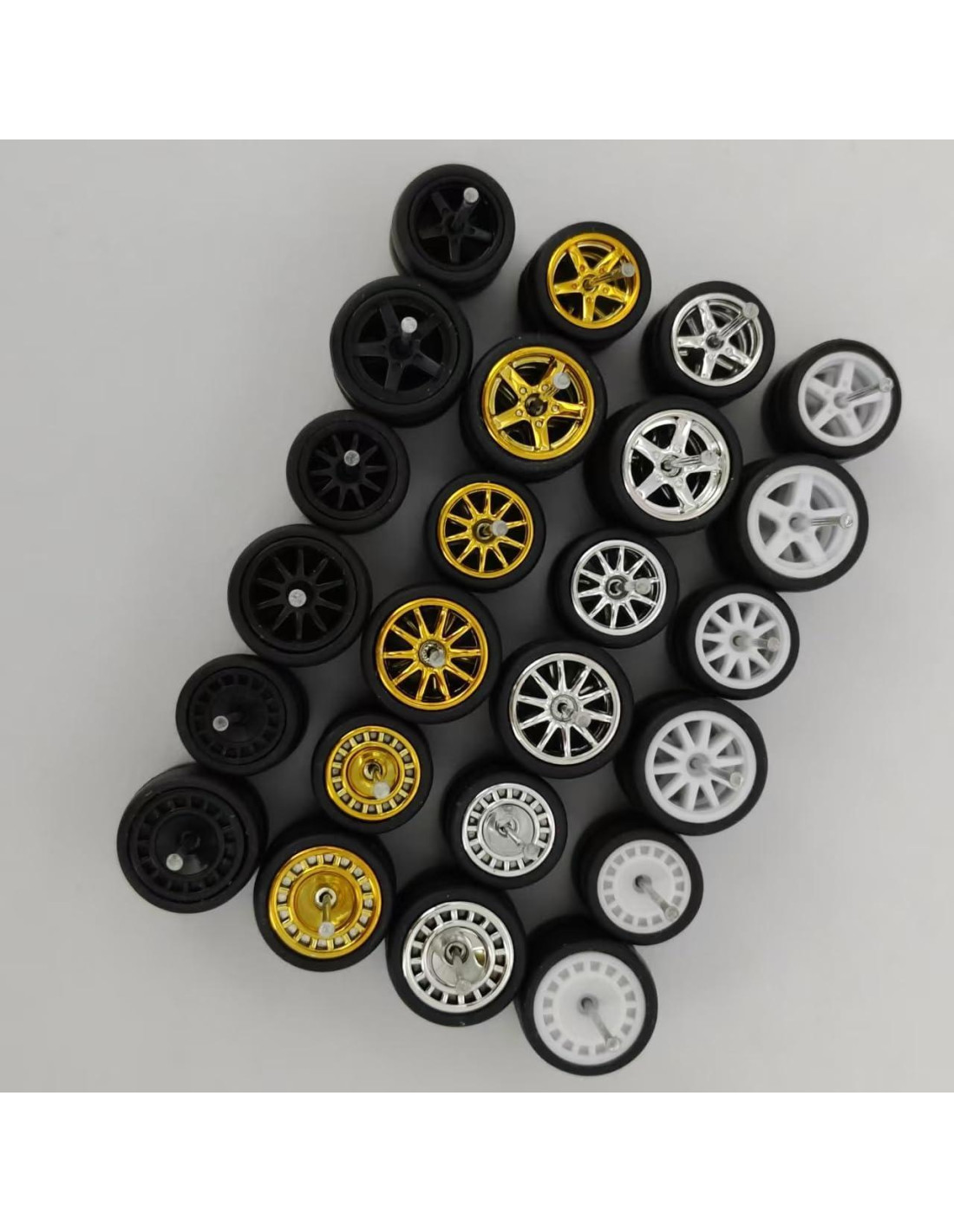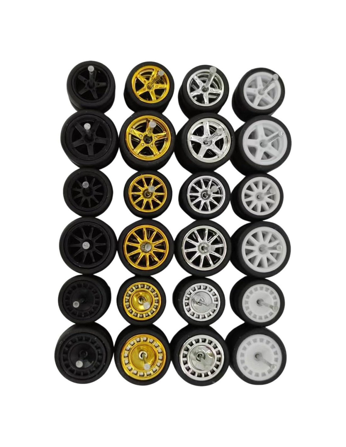 - 10 juegos de ruedas de goma progresivas - Dos tamaños diferentes Incluye 10 juegos aleatorios de ruedas en dos tamaños (10.5mm y 13mm), dando a tus coches a escala 1/64 como Hot Wheels, Matchbox y Mini GT un aspecto dinámico y realista.