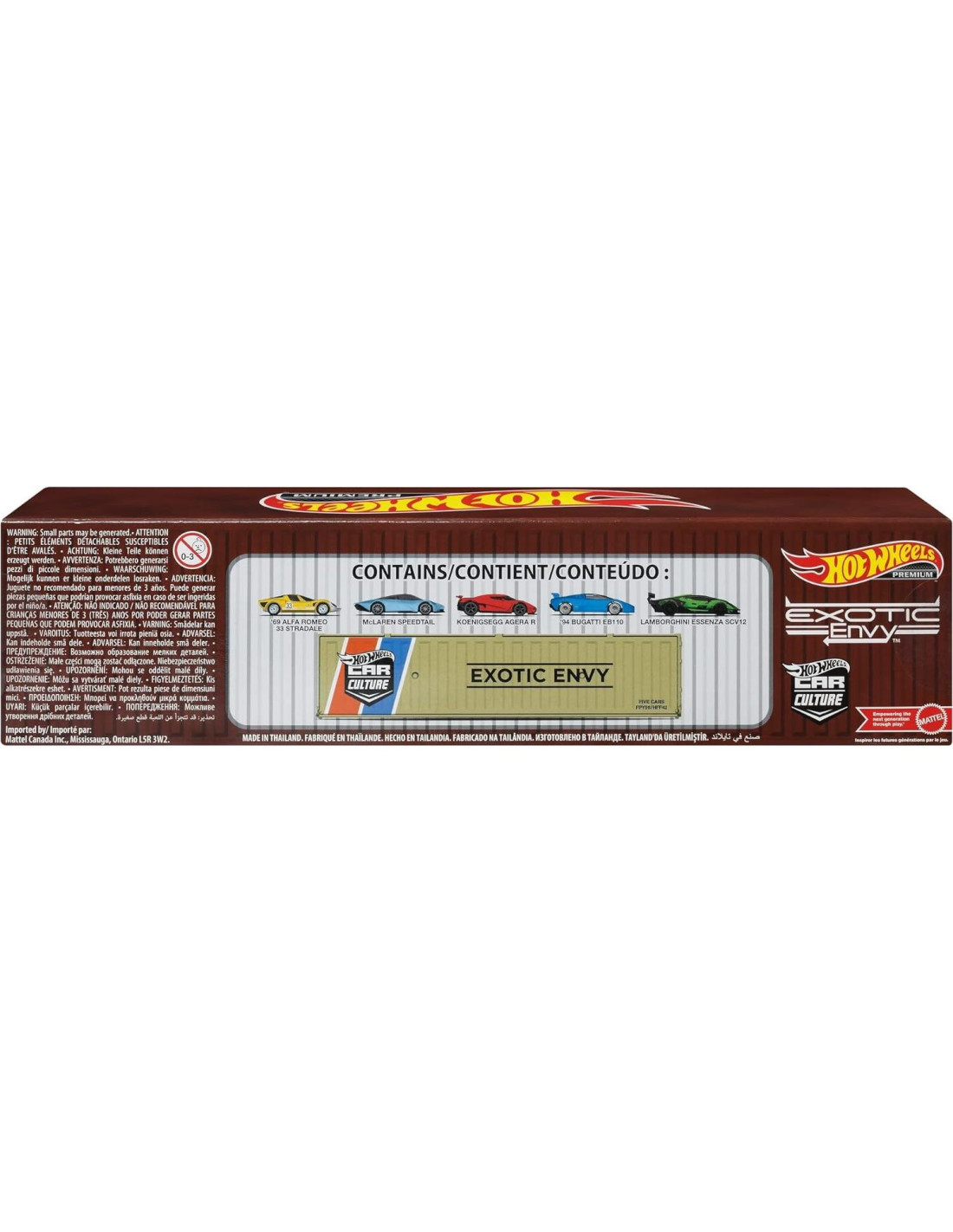 El Set de Contenedor Hot Wheels Premium Car Culture Speed Machines ofrece cinco coches deportivos icónicos que son conocidos por su capacidad de velocidad y estilo. Incluye réplicas de fabricantes venerados como Lamborghini, Bugatti, Koenigsegg, Alfa Romeo y McLaren. Cada vehículo es a escala 1:64 y presenta los diseños aerodinámicos que le valieron la insignia de Speed Machines. Su ejecución premium incluye construcción de cuerpo de metal completo y neumáticos Real Riders. Los colores y decoraciones pueden variar.