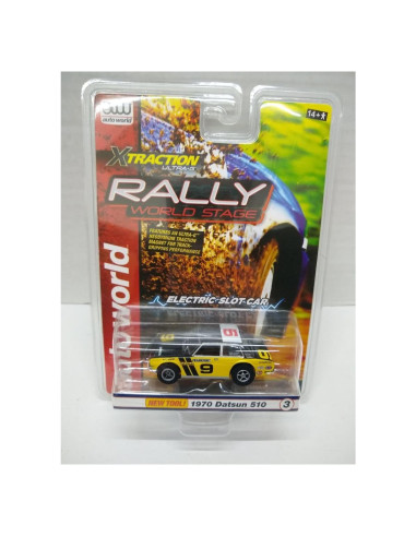 Auto World SC393-3A 1970 Datsun 510. Coche Eléctrico de Slot HO Escala. Serie Rally World Stage. Chasis XTraction Ultra-G. Lanzamiento 3. Amarillo y Negro - #9. Edades 14 y más. Coleccionable para adultos.