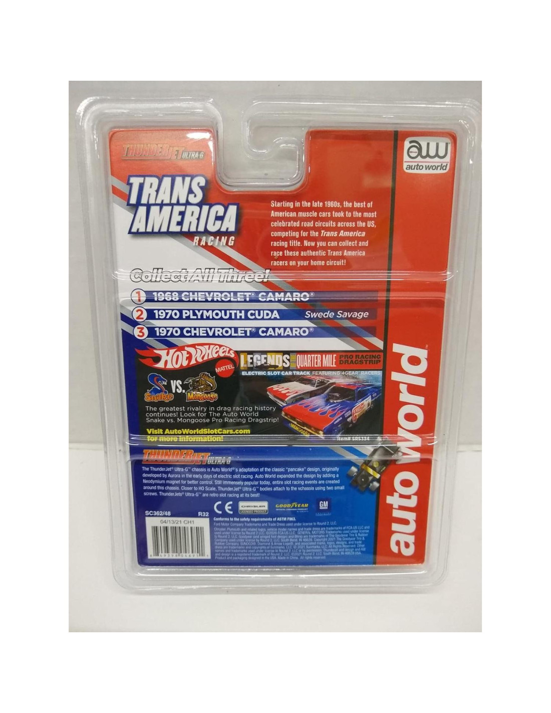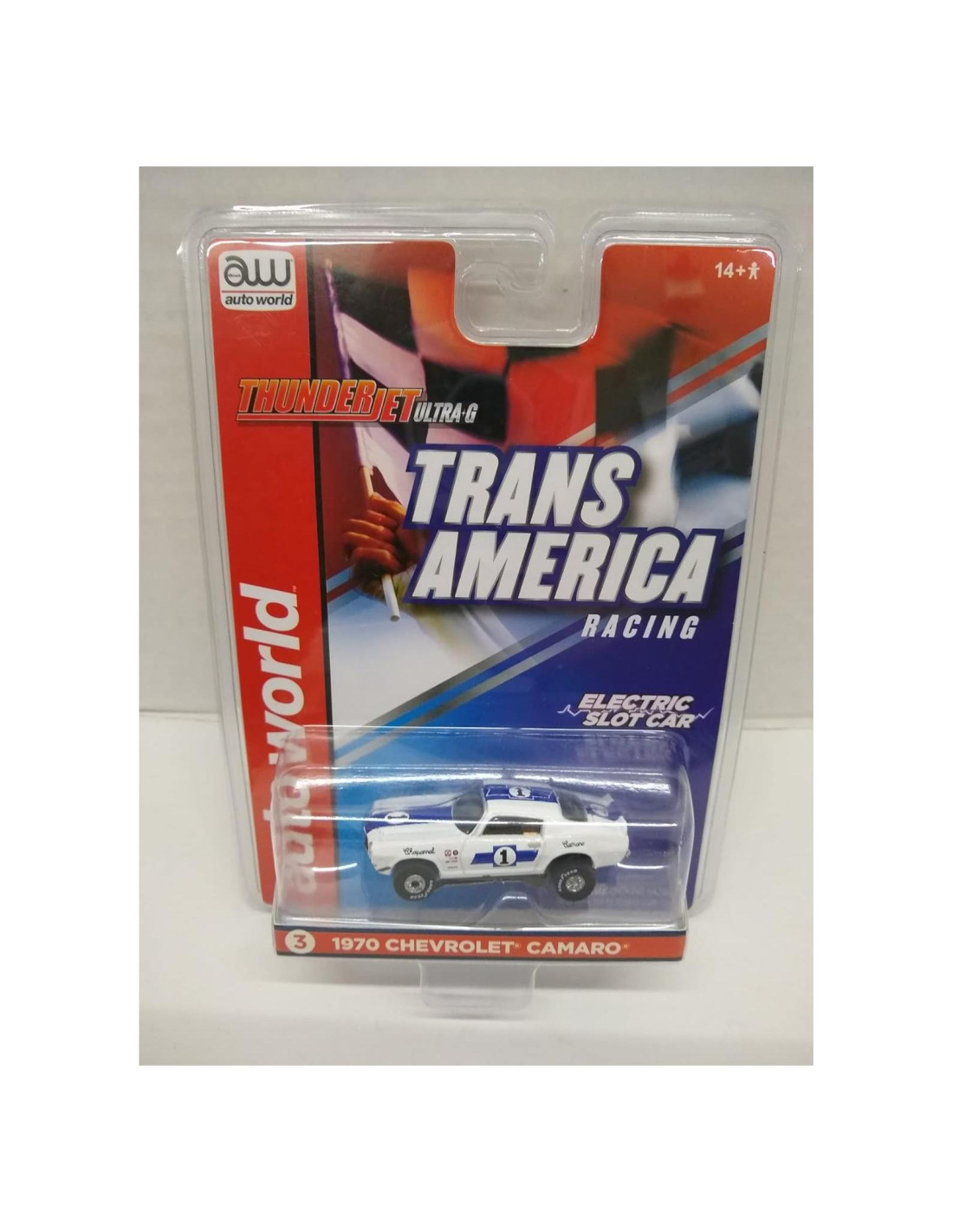 Auto World SC362-3 #1 '70 Camaro. HO Escala Coche de Slot Eléctrico. Trans America Racing Series. Chasis ThunderJet Ultra-G. Blanco con Rayas Azules. 1 de 3 en la serie. Lanzamiento 32. Producido en 2021. Edades 14 y más.