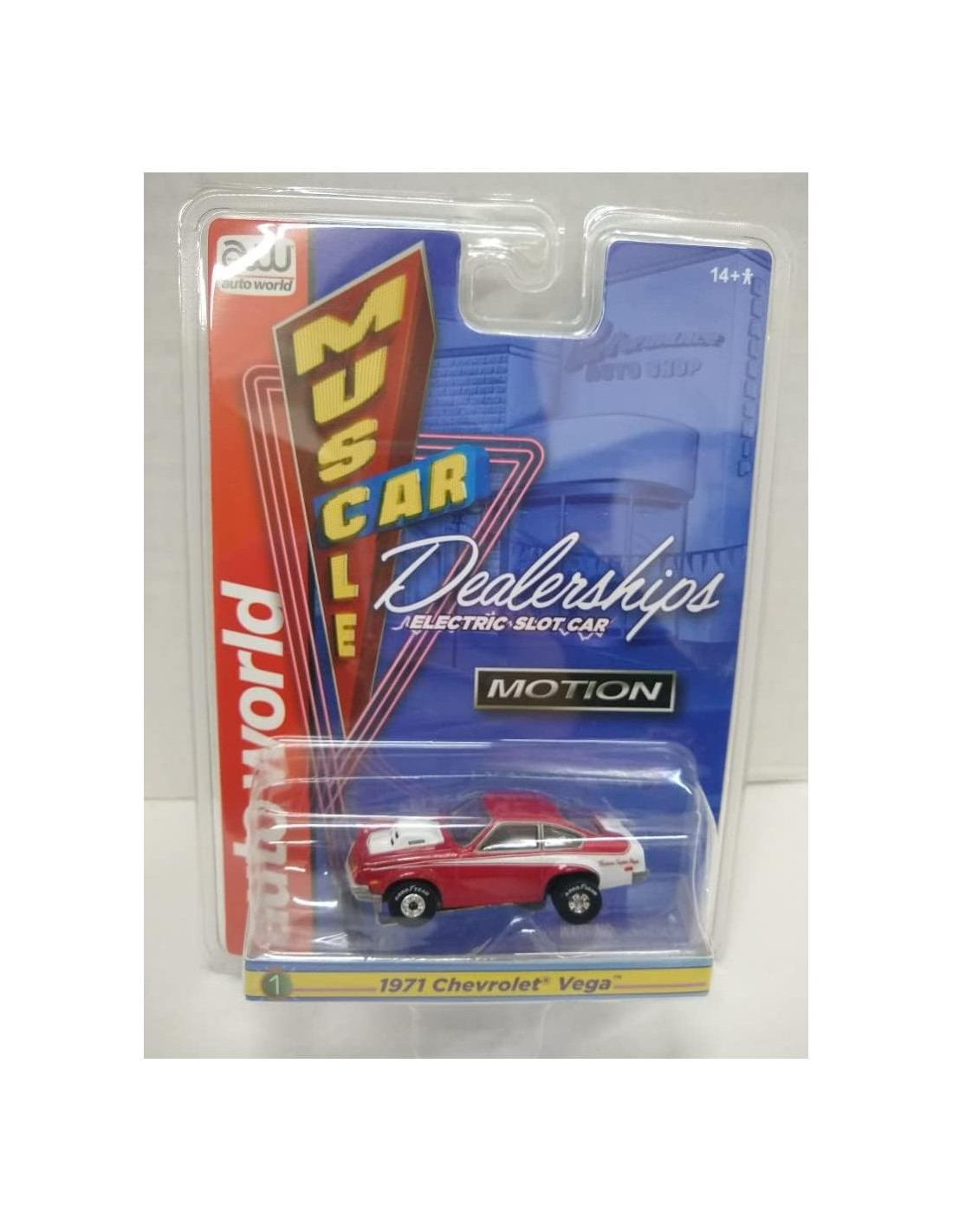 Auto World SC385-1B 1971 Vega. Rojo con Blanco. Coche de Slot Eléctrico Escala HO. Serie Concesionarios de Muscle Cars. Chasis ThunderJet Ultra-G. Lanzamiento 3. Producido en 2022. Edades 15 y más. Coleccionable para adultos.