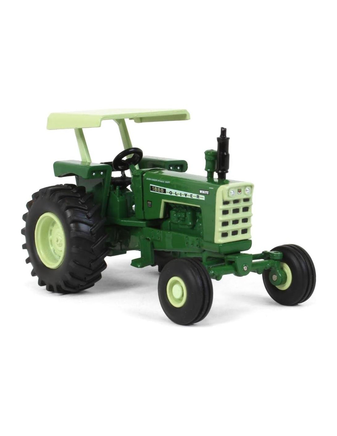 Hecho por Spec Cast, este Oliver 1855 a escala 1/64 con frente ancho es altamente detallado y muy frágil. Este tractor cuenta con un toldo y un enganche de 3 puntos que es compatible con la mayoría de los implementos a escala 64. Está construido de metal fundido con algunas partes de plástico y ruedas de goma. Según el fabricante, tiene una edad recomendada de 14+ años y no se recomienda para jugar.