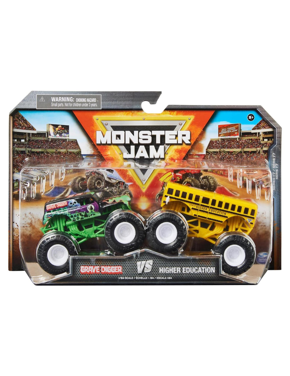 - ACCIÓN CARA A CARA: Realiza un increíble show de Monster Jam con el paquete de 2. Cada set viene con 2 icónicos camiones monstruo de Monster Jam, incluyendo Grave Digger vs. Higher Education, Bulldozer vs. Racing Stripes y más.