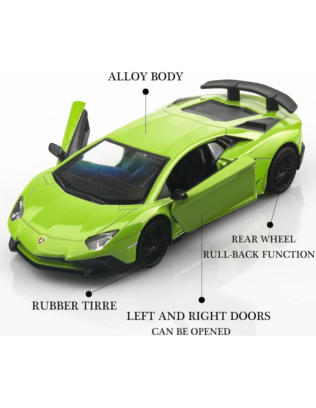 - Materiales de alta calidad: El coche de diecast Lamborghini está hecho de aleación de zinc, partes de plástico y neumáticos de goma, lo que lo hace seguro para que los niños jueguen. Presenta un interior y exterior detallados, y es muy resistente.