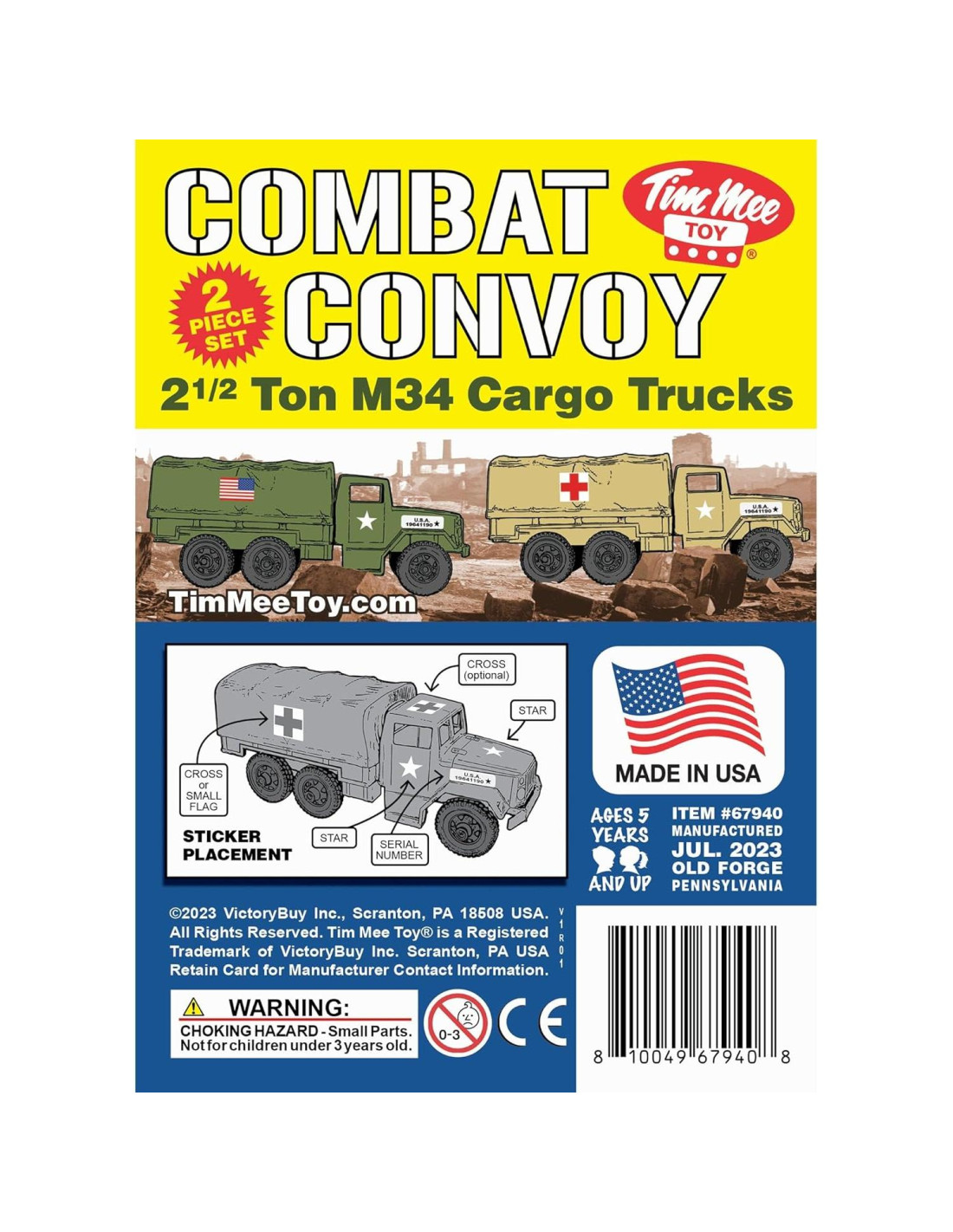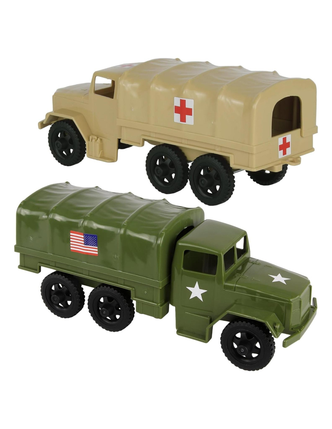 Un clásico americano vuelve a rodar. Estos camiones de carga Deuce-and-a-Half de 2-1/2 toneladas de Tim Mee están orgullosamente fabricados en los Estados Unidos y disponibles como este conjunto de 2 piezas que incluye 1 vehículo verde OD y 1 vehículo tan. Los camiones cuentan con una cubierta de lona removible y ruedas que giran con ejes de metal real. Cada camión tiene una escala de aproximadamente 1:35 y mide 20.32 centímetros de largo. Hecho de plástico HDPE ligeramente rígido con detalle medio y muy poco desecho. Este es probablemente el camión de soldados de ejército más icónico y popular de todos los tiempos y fue producido originalmente de 1964 a 1990 por Processed Plastic (la empresa matriz de Tim Mee). Modelado después del M34 o M35 construido por REO, es el artículo de Tim Mee más solicitado desde que los soldados M16 de Tim Mee fueron reeditados en 2011. La ubicación del molde original no se conoce, por lo que se hizo un molde de reproducción para traer este juguete clásico de vuelta a la vida. El único cambio en el diseño es que el enganche trasero se ha actualizado para coincidir con la actual Artillería de Patrulla de Combate Tim Mee para compatibilidad. Incluye una hoja de calcomanías con opciones de marcaje militar y médico. Estos son juguetes fabricados en EE. UU., destinados a ser rodados, derribados, recogidos y jugados durante años. Recomendado para mayores de 5 años.