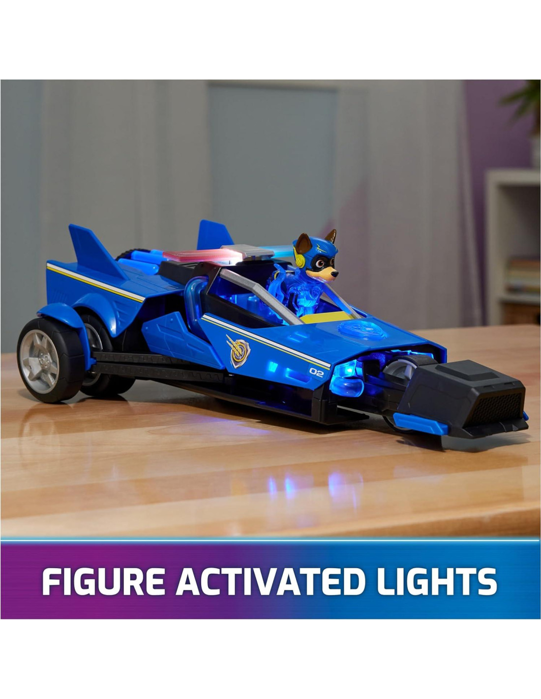 - FIGURA DE ACCIÓN DE CACHORROS PODEROSOS: Vestido con su uniforme de PAW Patrol: La Película Poderosa, esta figura de Chase única es imprescindible, con partes translúcidas que se iluminan cuando está en su vehículo