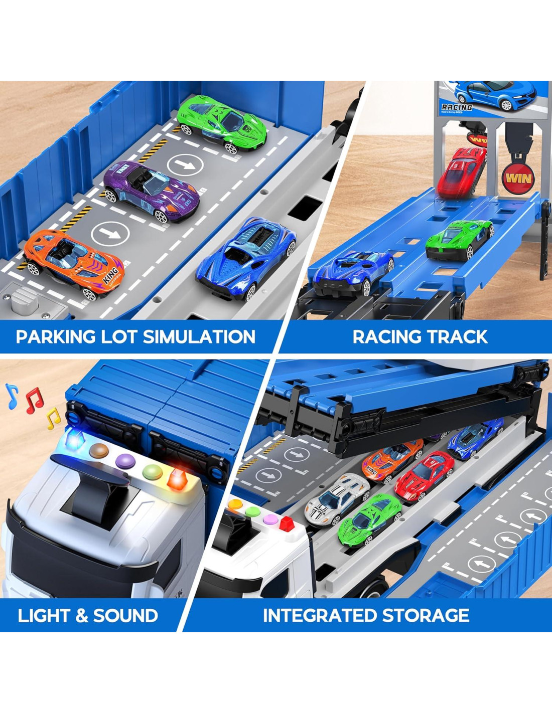 - Juguetes de Camión Transportador 3 en 1: Este camión de transporte tiene un diseño plegable, cuenta con un camión contenedor de pista de catapulta y un compartimento de almacenamiento para 8 autos de carrera de metal fundido coloridos, viene con luces intermitentes y hace varios sonidos de bocina de tráfico, proporcionando una experiencia de transporte completa para jóvenes entusiastas de los autos. También incluye señales de tráfico y señales de carrera para cualquier desafío de carrera.