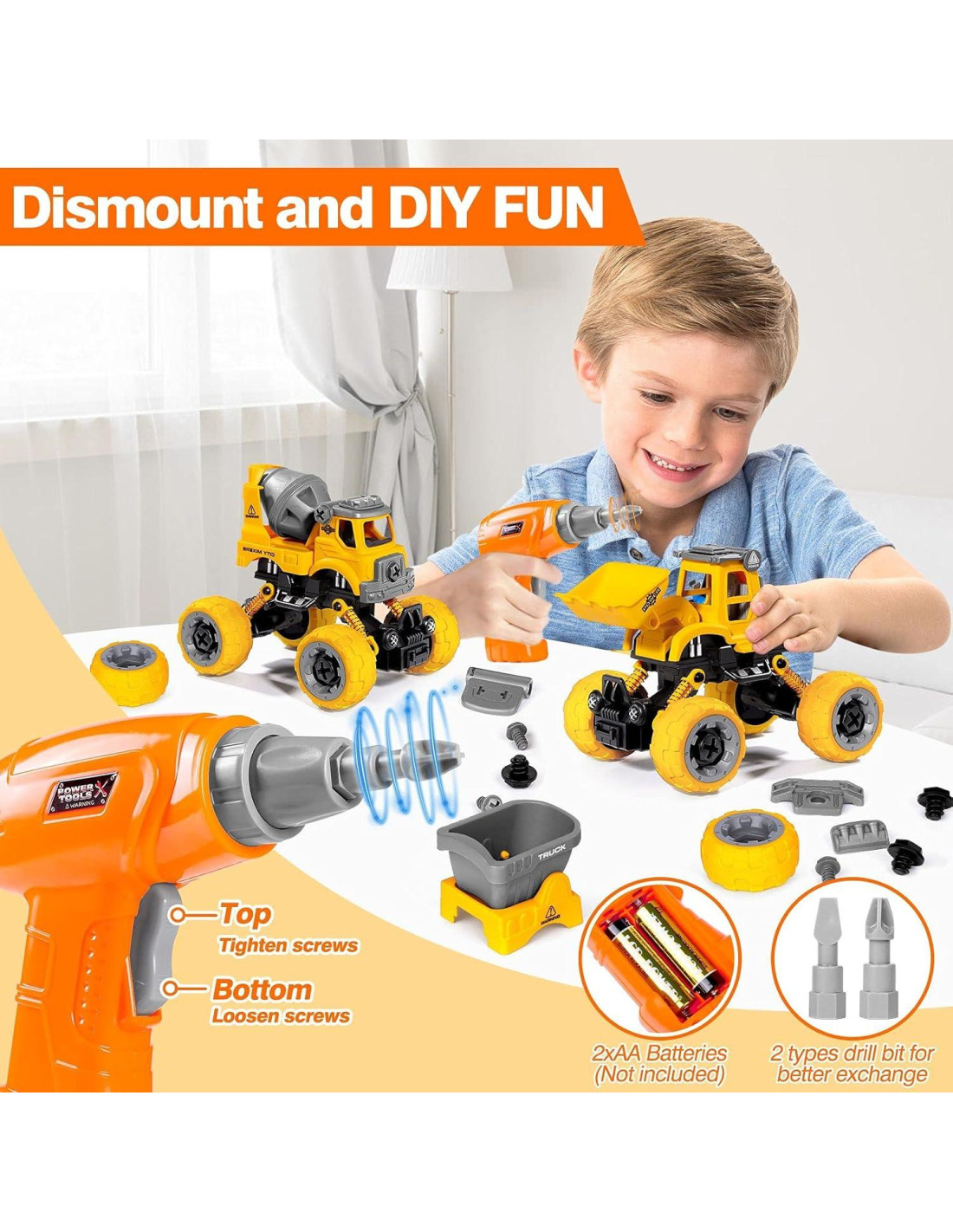 - DIVERSIÓN DIY DESMONTABLE: juguetes desarmables con taladro eléctrico y taladro manual. Dos botones en el taladro eléctrico (NECESITA 2 BATERÍAS AA, NO INCLUIDAS), fácil para que tus hijos atornillen o aflojen los tornillos del camión. El taladro manual se adapta bien a manos pequeñas para ensamblar o desensamblar, apretar a la derecha, aflojar a la izquierda. ¡Montones de diversión, construye tus propios pequeños juguetes de camión de construcción!
