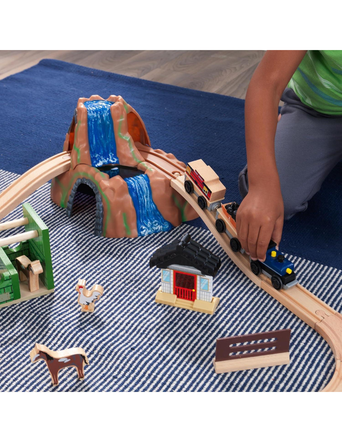 ¡La vida en la granja es una verdadera aventura! El juego de tren de granja KidKraft permite a los niños explorar lo que es cuidar de los animales, recoger huevos y cultivar con 75 coloridas piezas temáticas rurales. El tren serpentea a través de la serena cascada, sobre el puente y alrededor del granero. Los pasajeros vislumbran el estanque de patos, completo con un pato amarillo y un bote. Un establo alberga un caballo y una vaca con pacas de heno, y el molino de viento gira perezosamente en la brisa. Este conjunto está diseñado cuidadosamente para proporcionar años de diversión imaginativa.