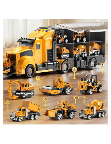 - Juego de Juguetes de Camiones de Construcción con Alfombrilla: Nuestro camión de transporte incluye 1 gran camión transportador de construcción con sonido y luces, alfombrilla de juego plegable, excavadora, camión de cemento, montacargas, bulldozer, rodillo de carretera, camión de volquete y señales de construcción. Perfecto para niños pequeños que aman los camiones de juguete y los coches de modelo.