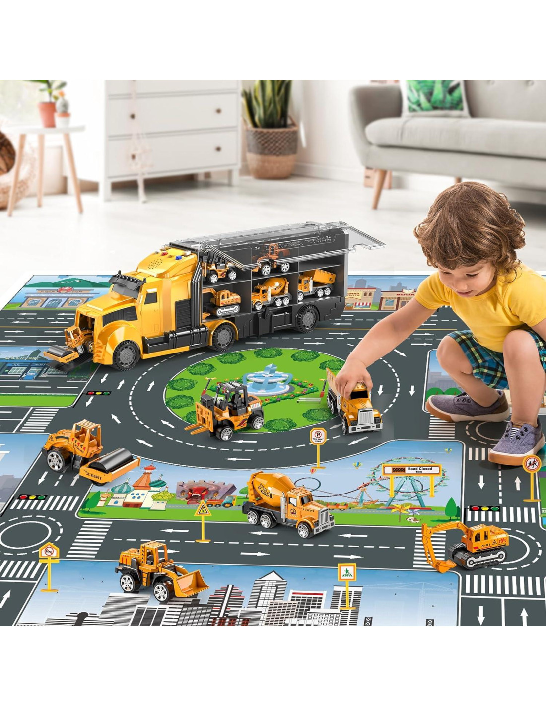 Los juguetes de construcción para niños incluyen una alfombrilla de juego plegable, un gran camión transportador de construcción con sonido y luces, excavadora, camión de cemento, montacargas, bulldozer, rodillo de carretera, camión de volquete y señales de construcción.