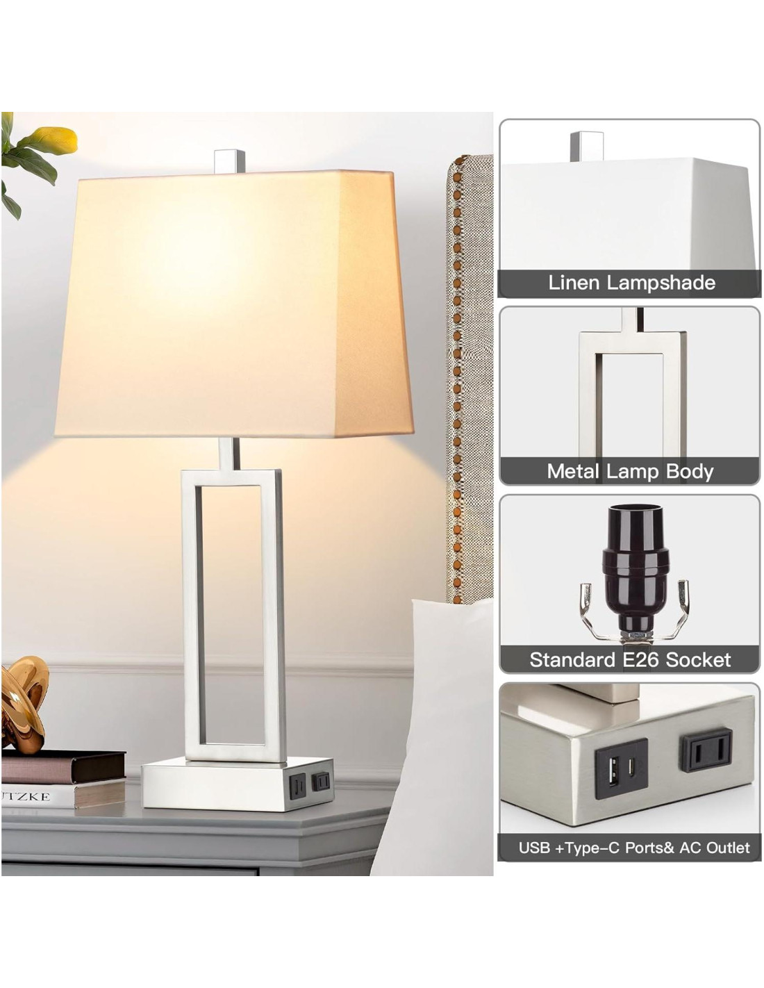 La lámpara de mesa moderna tiene niveles de brillo regulables en 3 niveles (Bajo, Medio, Alto) que se pueden ajustar convenientemente tocando en cualquier parte de su parte metálica. Es adecuada para tu mesita de noche, mesa auxiliar, dormitorio o sala de estar y elimina la molestia de buscar el interruptor en la oscuridad. Los dos puertos USB de alta potencia y la salida de CA ofrecen velocidades de carga avanzadas para cargar rápidamente los últimos teléfonos, tabletas y computadoras portátiles. ¡Con esta lámpara de mesa innovadora disfruta de una iluminación más cálida y acogedora! Crea una atmósfera cálida, acogedora y cómoda en tu hogar con la combinación de una base de metal plateado elegante y una pantalla de lámpara rectangular suave. Crea un estilo de vida cómodo para tu hogar. LOLIKIT se compromete a ofrecer lámparas de mesa profesionales y proporcionarte una iluminación de calidad excepcional, un diseño hermoso, material duradero a precios asequibles. ¡Para crear productos que mejoren la vida de las personas y hagan la vida más conveniente, y vivir cómodamente y acogedoramente en el momento!