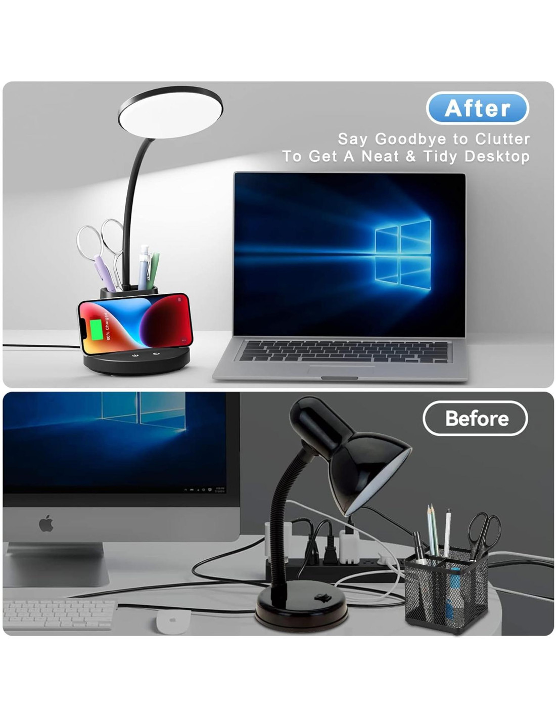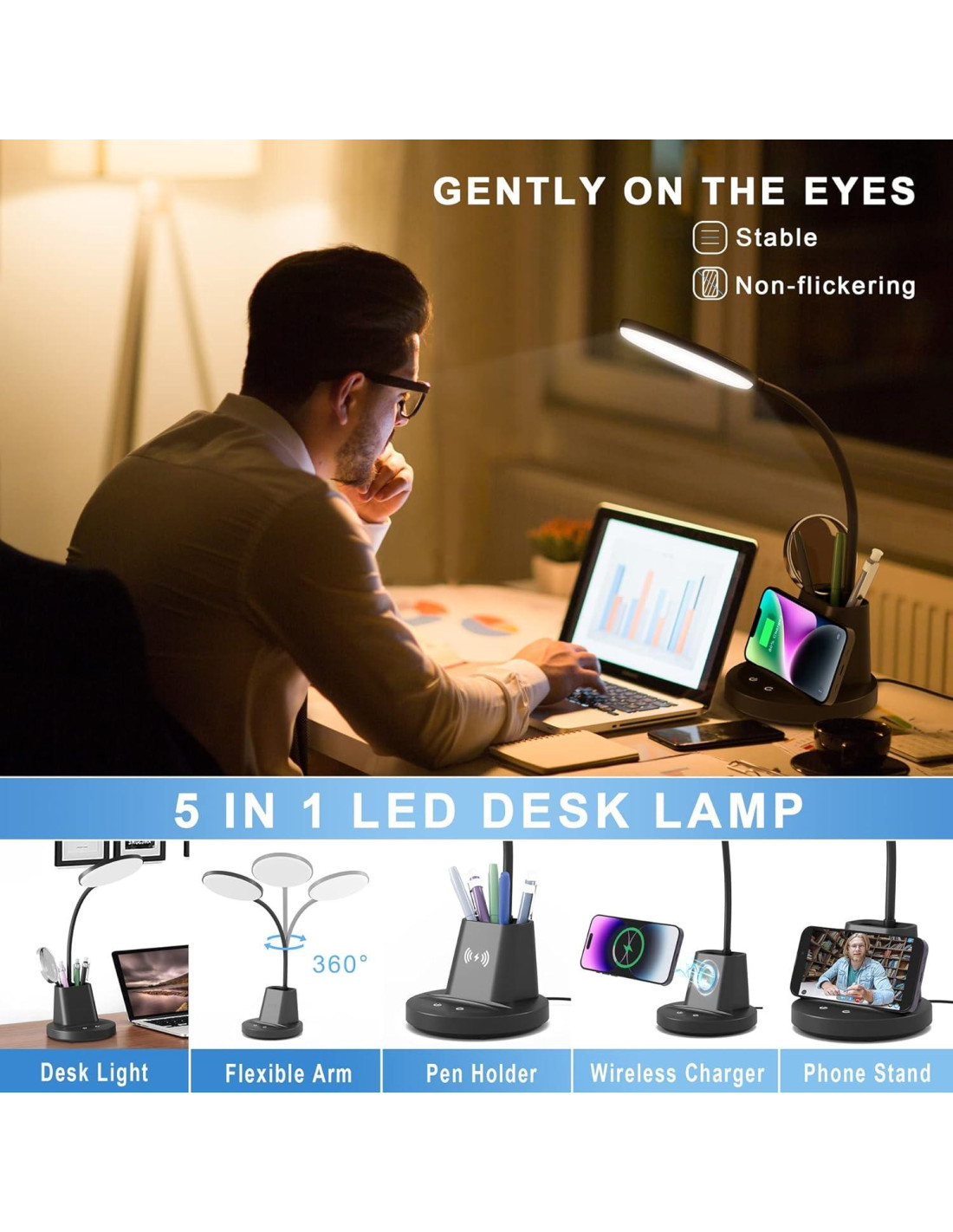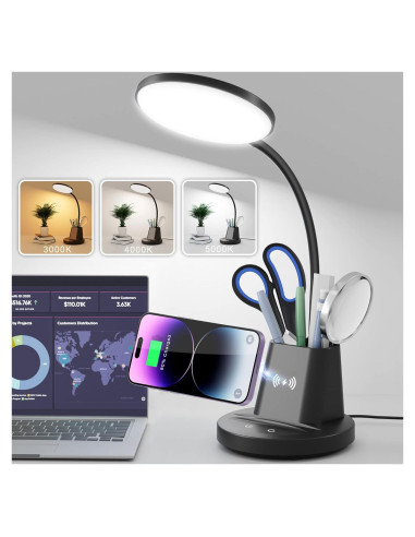 - Lámpara de Escritorio con Cargador Inalámbrico: Lámpara de escritorio LED con un cargador de teléfono inalámbrico incorporado y soporte para plumas. Esta lámpara de escritorio de oficina es compatible con iPhones y la mayoría de los dispositivos que soportan carga rápida de smartphones a 10W. Te encantará esta función para ayudarte a ver películas mientras cargas tu teléfono. La lámpara de escritorio pequeña también viene con un adaptador de 1.8m, por lo que no necesitas comprar adaptadores por separado. Un adaptador de 5V/3A proporciona carga óptima y luz estable. (Adaptador Incluido)