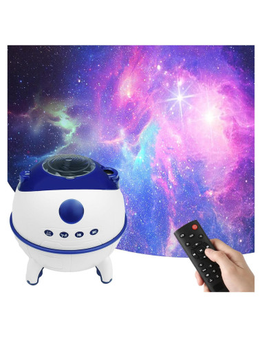 - [Control Remoto y Función de Botones] El proyector de luz nocturna estrellada está diseñado con dos métodos de control: botón y control remoto, puedes ajustar el brillo, el modo de color y la velocidad de rotación de la nebulosa mediante el control remoto, los modos de estrella o nebulosa se pueden usar combinados o separados. También puedes encender/apagar, ajustar el modo de nebulosa, música o sonido mediante los 4 botones en la parte posterior de la luz del proyector.