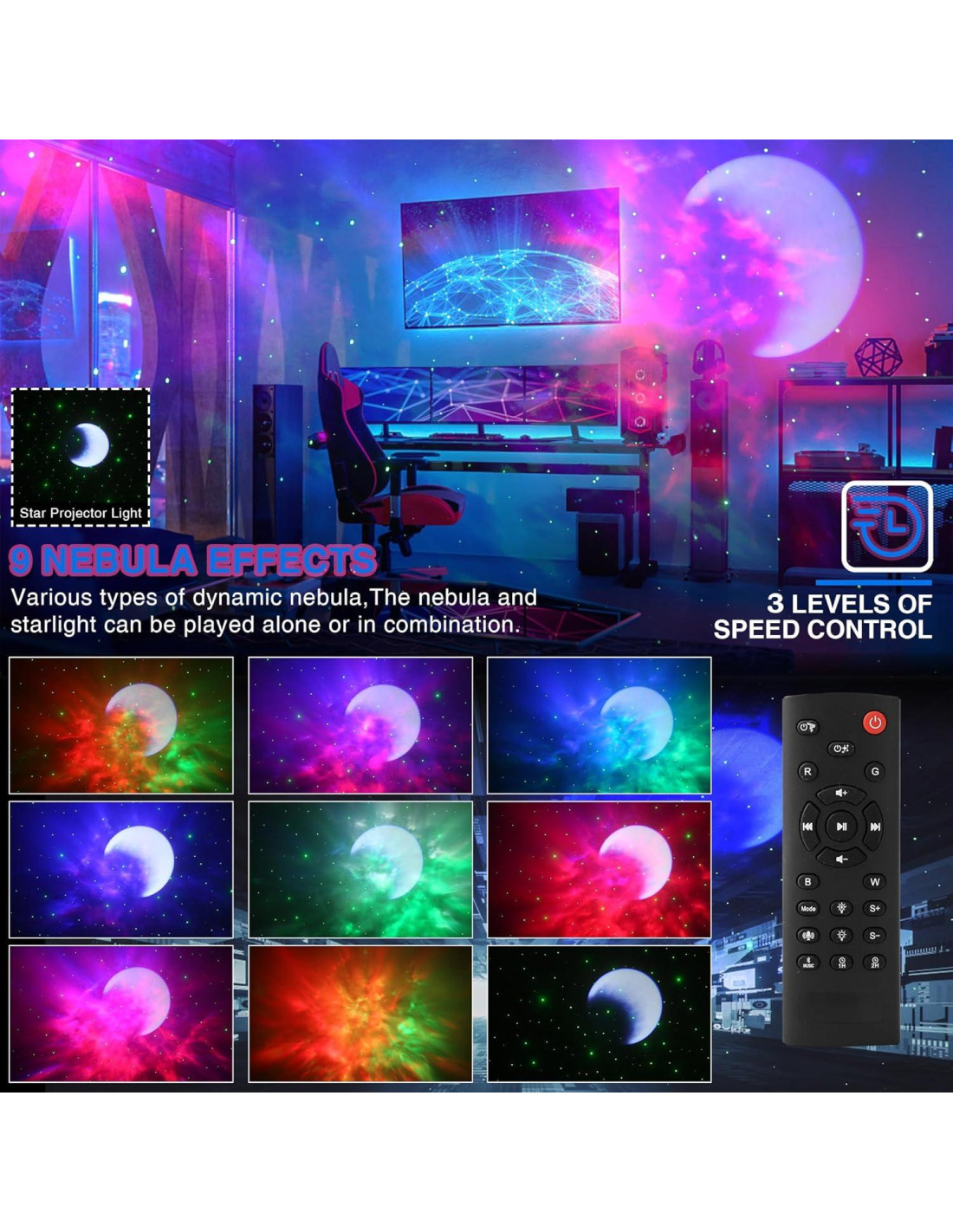 - [9 Proyector de Estrellas Nebulosas] La luz nocturna proyector de estrellas cuenta con 9 impresionantes efectos nebulosos combinados con estrellas verdes centelleantes. Proyéctalo en la pared o el techo de tu habitación y creará la colorida luz de galaxia para ti, se puede usar en dormitorios, salas de juegos, hogar, salas de estar, decoraciones de escritorio, creando un espacio maravilloso y relajante en tu uso diario.