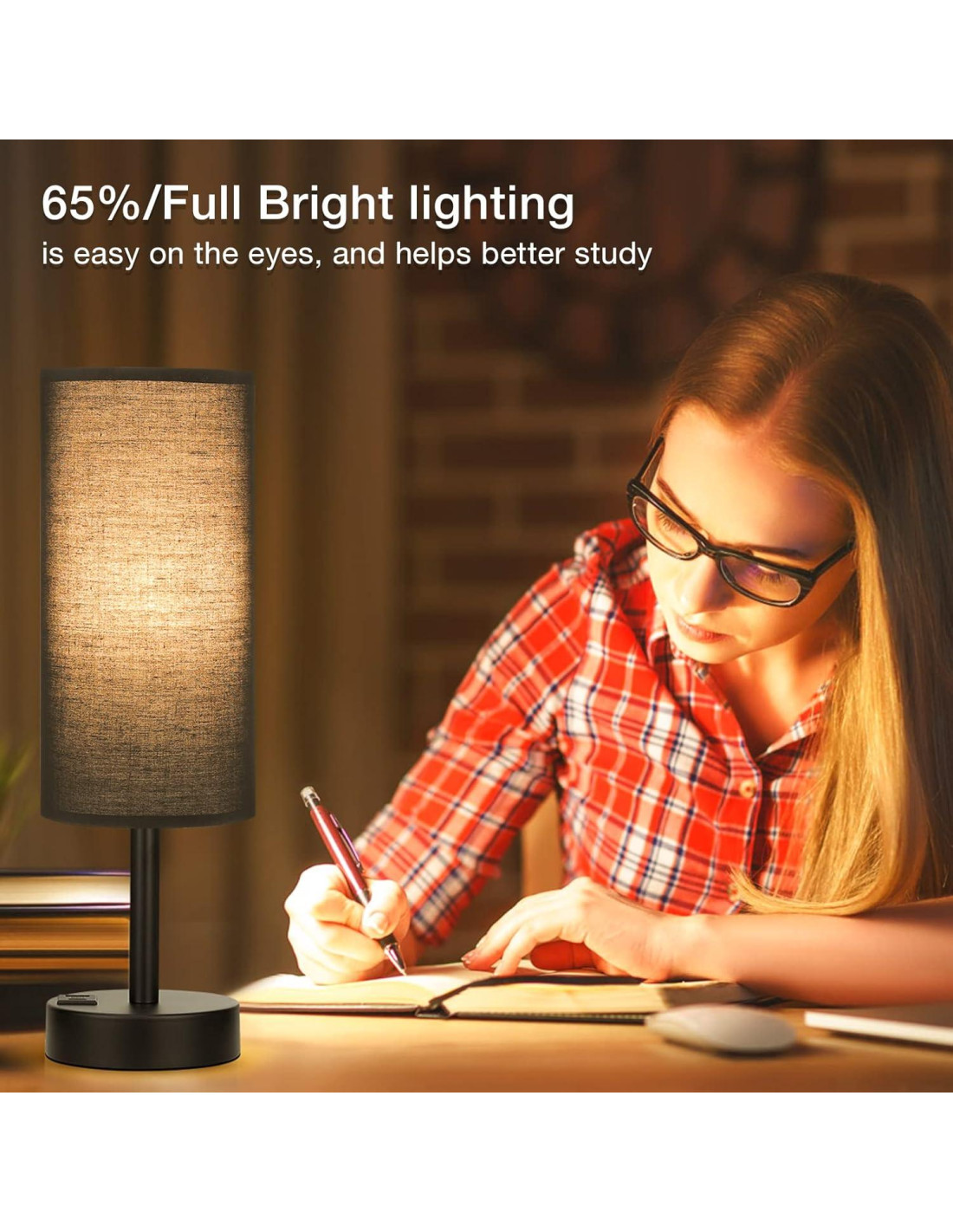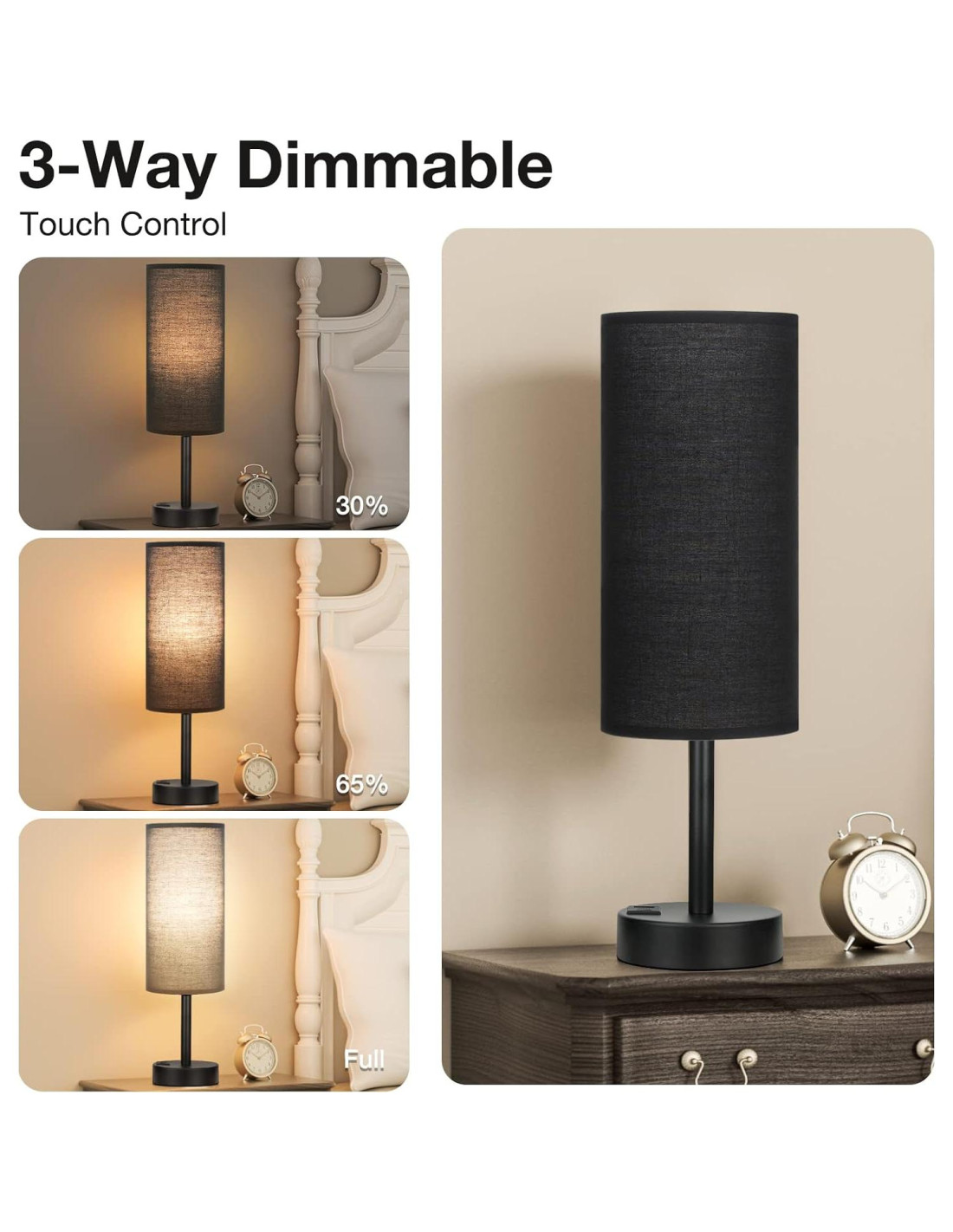 La lámpara de mesita de noche pequeña Dicoool quiere traer conveniencia, belleza y felicidad a tu vida. Trabajaremos para ahorrar tu tiempo y espacio y mejorar tu calidad de vida. Ama cada día, disfruta cada noche, comenzando aquí. 30% Luz para Dormir 30% es la luz más suave, que puede usarse como luz nocturna para acompañarte si tienes miedo a la oscuridad o ceguera nocturna. 65% Luz de Trabajo 65% es una luz cómoda, ni tenue ni deslumbrante, es una opción ideal al navegar por el teléfono, protege tus ojos y reduce el daño de la radiación electromagnética. Luz Completa para Leer La luz completa te permite leer las palabras en el libro claramente, brindando una luz más brillante cuando estudias o trabajas. Lámpara de Dormitorio Funcional con Puertos USB y USB-C Tendrás dos puertos de carga rápida con salida de 5V 2.1A. Los puertos USB y TYPE-C te permiten cargar la mayoría de los dispositivos electrónicos. Ya no necesitas regletas de enchufes adicionales y no tendrás más cables desordenados en tu habitación. La lámpara de mesita de noche con puertos USB es un gran artículo que ahorra espacio y tiempo y mejora la calidad de vida. El material de lino premium no es barato, se ve genial y dura mucho. Carga rápidamente tus dispositivos con puertos USB y USB-C. Sin parpadeos, ahorro de energía, la vida útil es 30 veces la de una bombilla ordinaria.