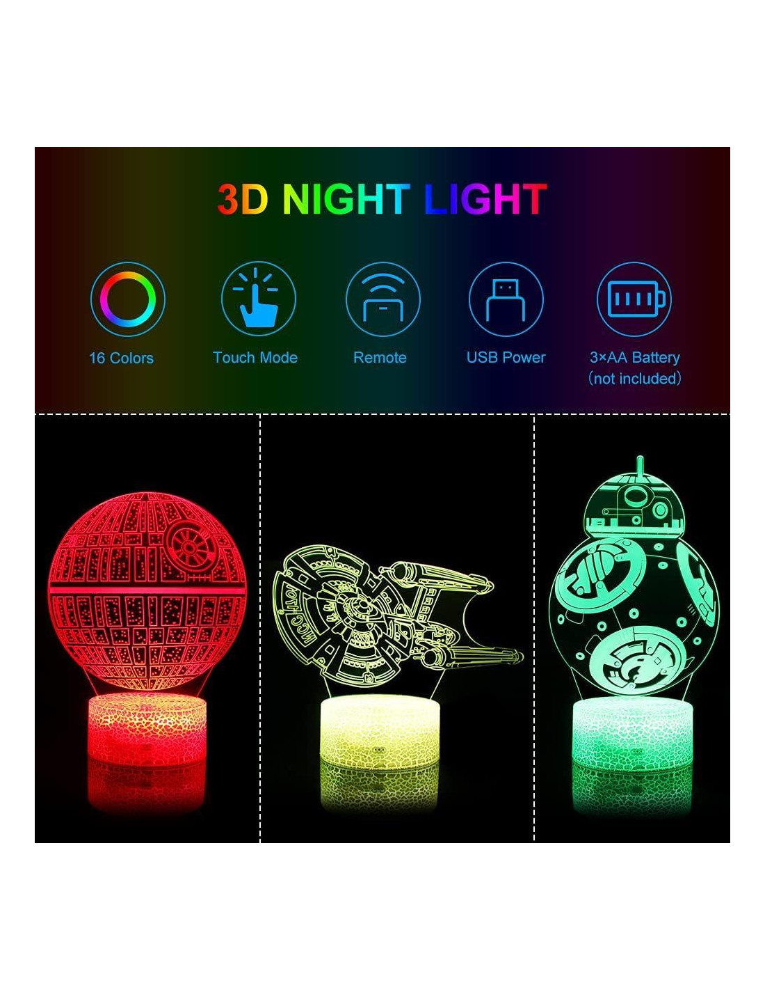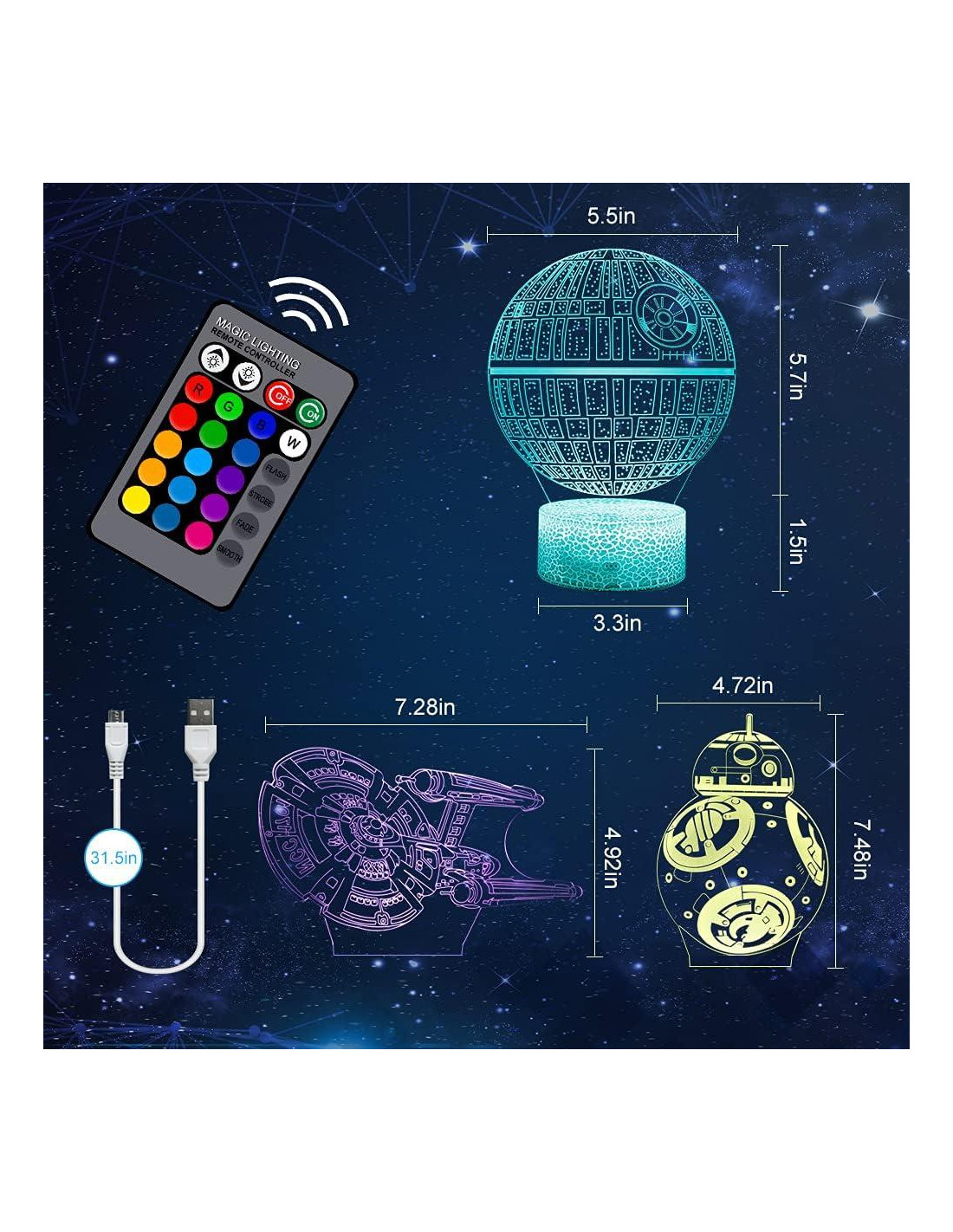 - 3 Patrones 16 Colores: Estrella de la Muerte/BB-8/Naves Estelares. Puedes elegir entre hasta 7 colores diferentes con el toque de un botón ubicado en la base de la lámpara, 16 colores mediante control remoto incluido en el paquete