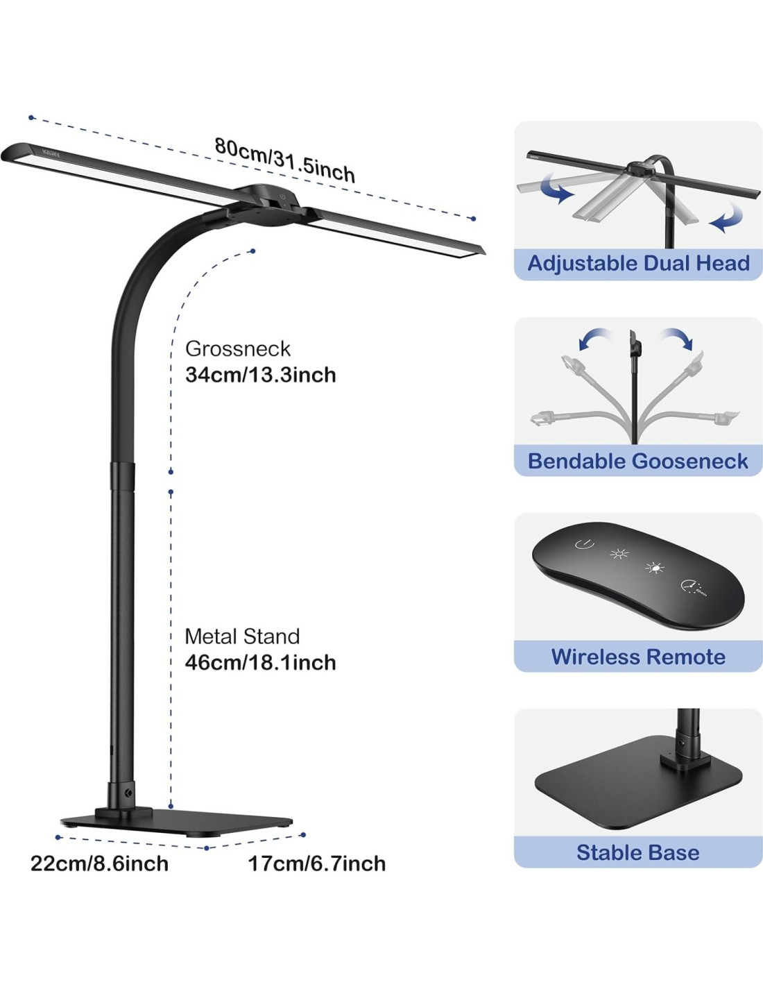 - DIRECCIÓN DE LUZ FLEXIBLE Y AJUSTABLE: El diseño de doble cabeza de esta lámpara de escritorio permite una rotación libre, proporcionando flexibilidad para dirigir la luz exactamente donde la necesitas. Esto asegura que solo tu escritorio y teclado estén iluminados, reduciendo el deslumbramiento en tus pantallas y protegiendo tus ojos de la fatiga.
