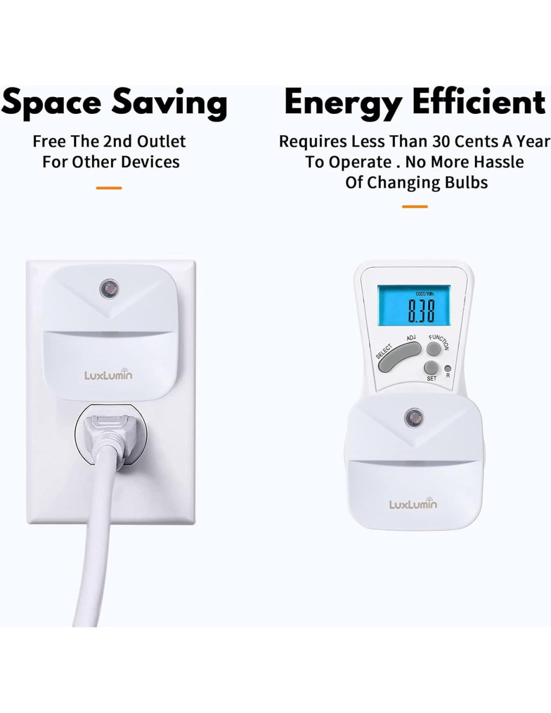 Sensor de crepúsculo a amanecer fotosensible incorporado, el sensor de luz reconoce inteligentemente el día y la noche, y el entorno oscuro se ilumina automáticamente. Seleccionado con luz blanca de 6000K y estructura óptica científica crea una atmósfera de luz suave e indirecta y cómoda. Cuesta aproximadamente 30 centavos al año usar la luz nocturna Luxlumin de 0.4W durante 8-12 horas por noche. Simplemente enchufe la luz nocturna y no tiene que preocuparse por el consumo de energía. No es demasiado brillante ni demasiado tenue para dormir y puede servir como luz de guardería por la noche. Se siente fresca al tacto incluso después de un uso extenso. Es seguro usarla durante largos períodos sin riesgos de incendio para su tranquilidad. En LuxLumin valoramos su completa satisfacción con nuestros productos que todos llevan una promesa de calidad excelente de por vida. Puede ser ampliamente utilizada en dormitorio, baño, pasillo, cocina, escaleras, etc. 4 paquetes pueden ser utilizados en toda su habitación.
