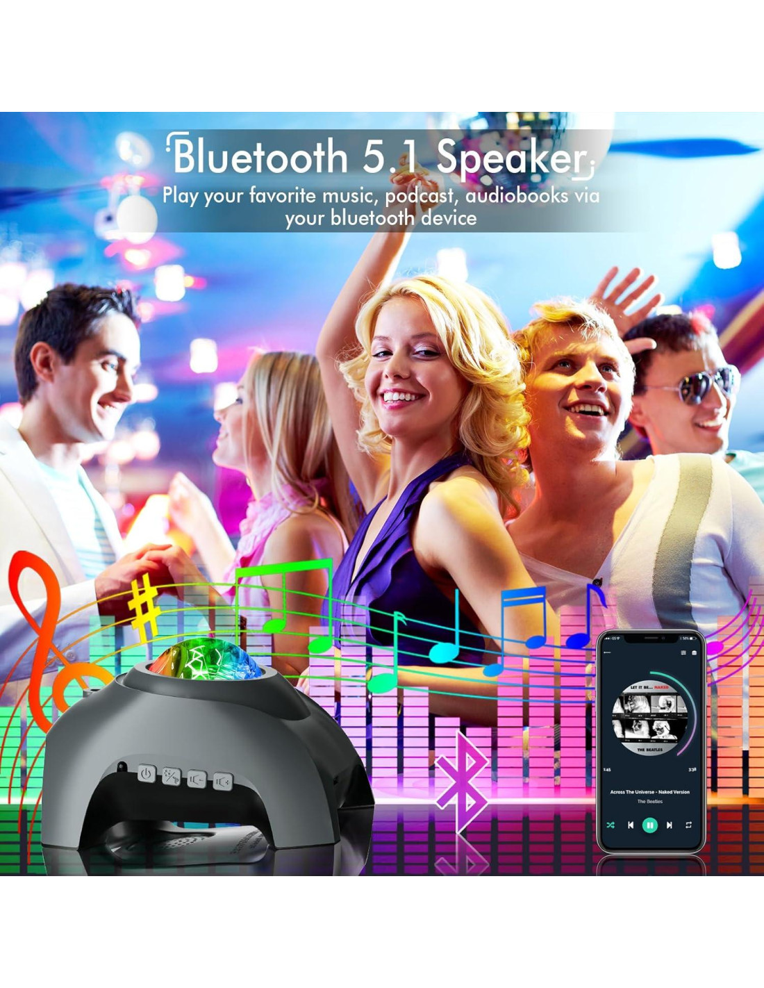 - Usos específicos del producto: Proyector Galáctico, Luz Nocturna, Ruido Blanco Integrado, Altavoz Bluetooth