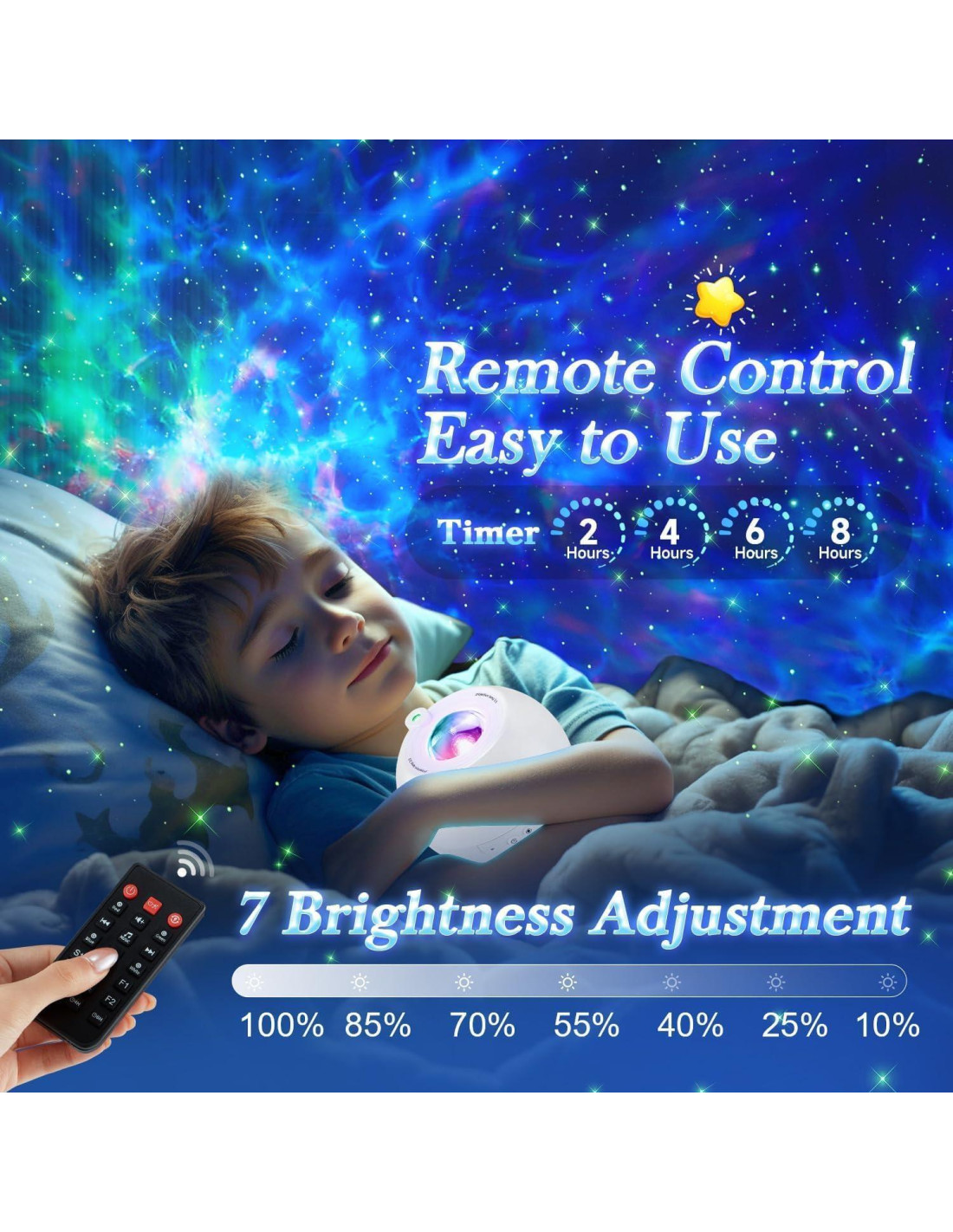- [Control Remoto + 4 Temporizadores + 7 Niveles de Brillo Proyector de Luz Nocturna para Niños] El proyector de luz nocturna galaxy para dormitorio funciona no solo con los botones del proyector de estrellas para niños, sino también con el control remoto a larga distancia, cambiando colores, ajustando brillo, velocidad de movimiento, encender / apagar. El proyector galaxy para adultos tiene 7 modos de brillo, por lo que puedes ajustar el brillo de las estrellas para techo según la ocasión de uso, para que tus ojos se sientan más cómodos. Con el temporizador de apagado automático de 2/4/6/8h para luces de proyector de estrellas para techo, no tienes que preocuparte de que el proyector de luz nocturna galaxy se quede encendido toda la noche cuando quieras dormir, ¡solo configura el temporizador de apagado automático!